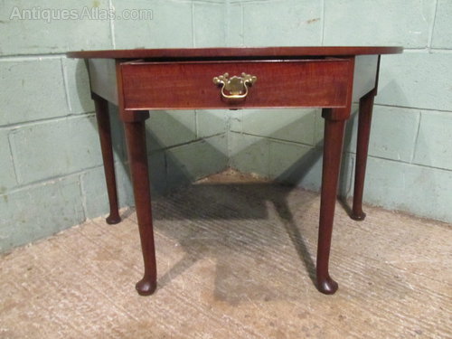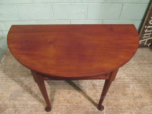 Antique Georgian Mahogany Demi Lune Side Table and dating from around George 111 c1780. Constructed from solid mahogany it has a squared edge to the top above a deep skirt with one drawer which is mahogany lined and with ornate brass handle. It stands on round tapering legs on a pad foot.