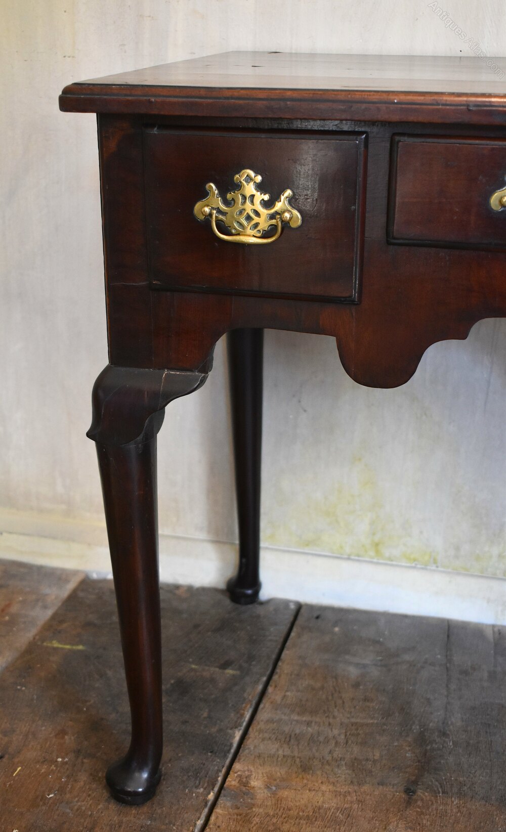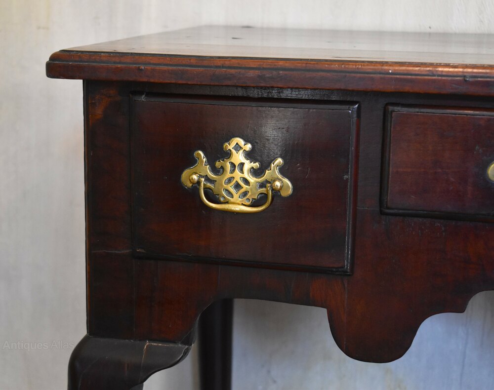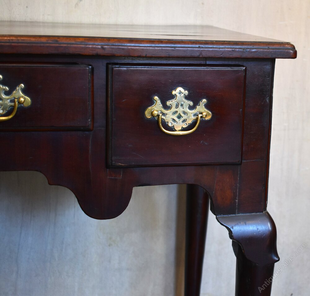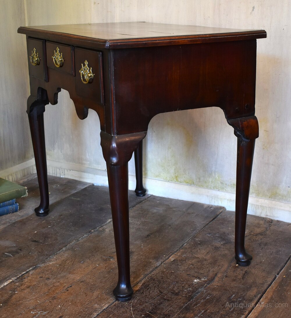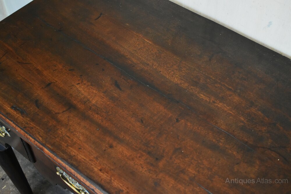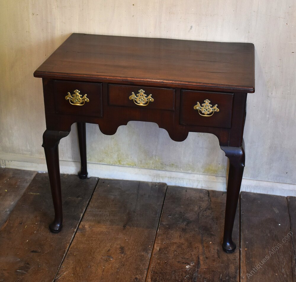 A charming example of a Georgian mahogany lowboy. The stands on straight tapered club legs with pad feet, carved at the shoulders to give the appearance of a cabriole curve. The piece has the typical three drawer configuration for a lowboy with shaped apron below. The drawers all retain the original handles with Chippendale style pierced backplates, and the drawer fronts have a nice thumbnail moulded edge which is repeated to the top. The lowboy has a great untouched colour and patina, the deep red of Georgian period mahogany. The piece is in good antique condition, it has some old repairs and faults, such as a split to the top, but this is all part of the character. This is a fine and charming provincial example of a Georgian mahogany lowboy, a classic piece of English period furniture. C.1760.