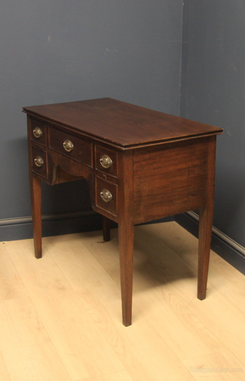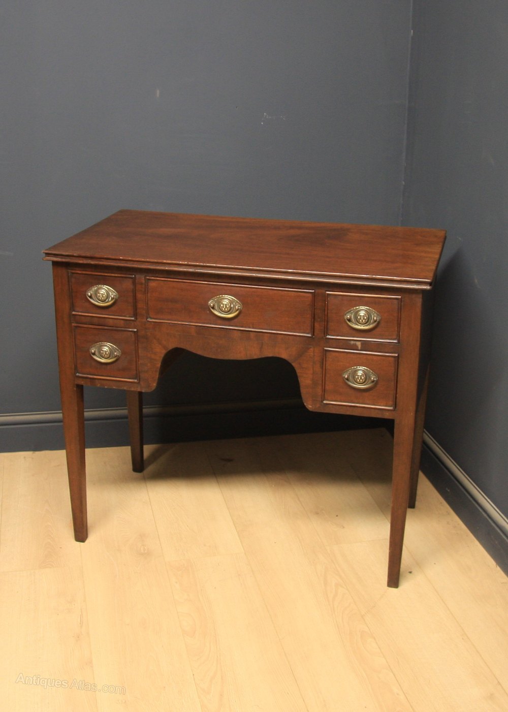Good quality Georgian mahogany lowboy side table having solid mahogany top with D moulded edge over 5 drawers with oval brass handles all standing on square tapered legs.