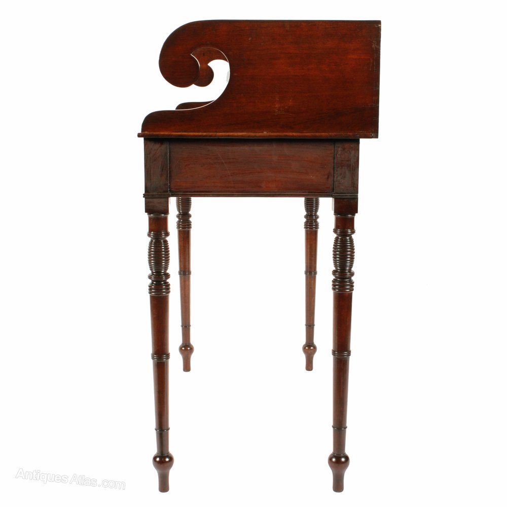 The table has a shaped gallery back and four turned tapering legs with decorative ring turned details.