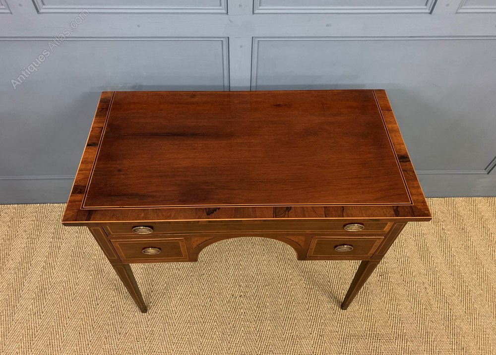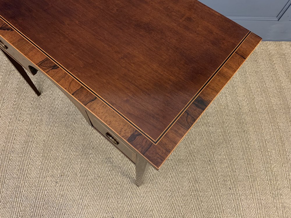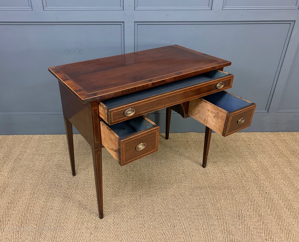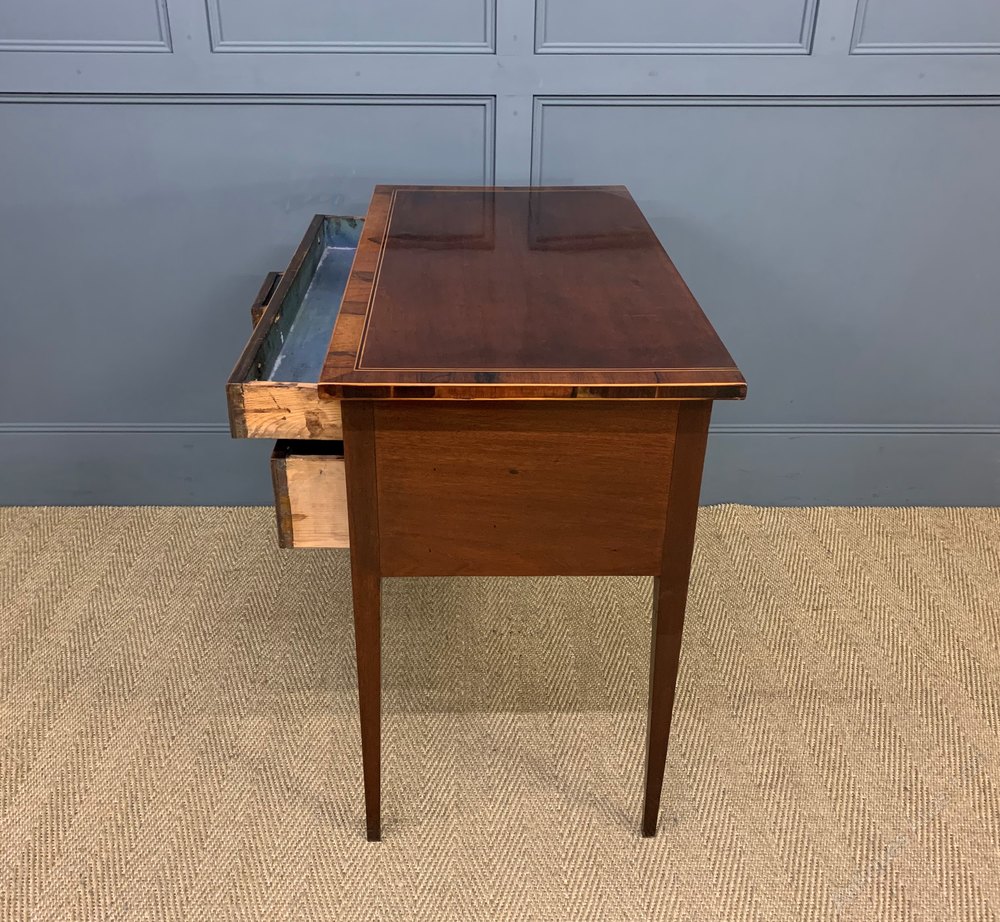 A very good George III period mahogany side table, or lowboy. Of fine construction in solid mahogany with attractive mahogany veneers, rosewood banding and box wood inlay. With an arrangement of one long and two short drawers, all fitted with their original solid brass handles. Standing on square tapering legs. Offered for sale in excellent condition, with a rich colour and patina, ready to go straight into the home.