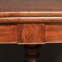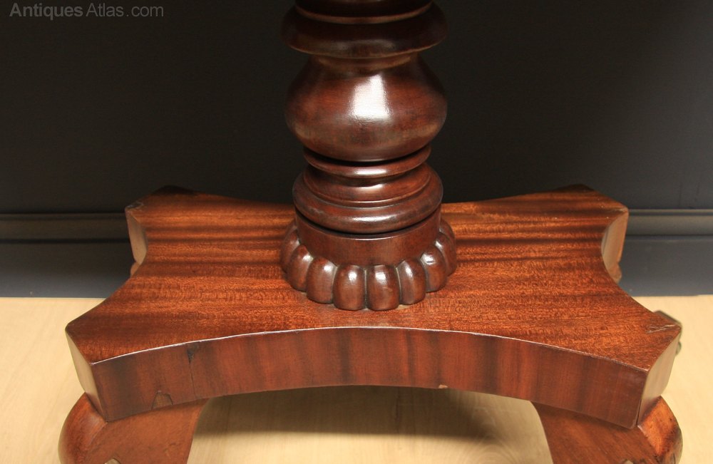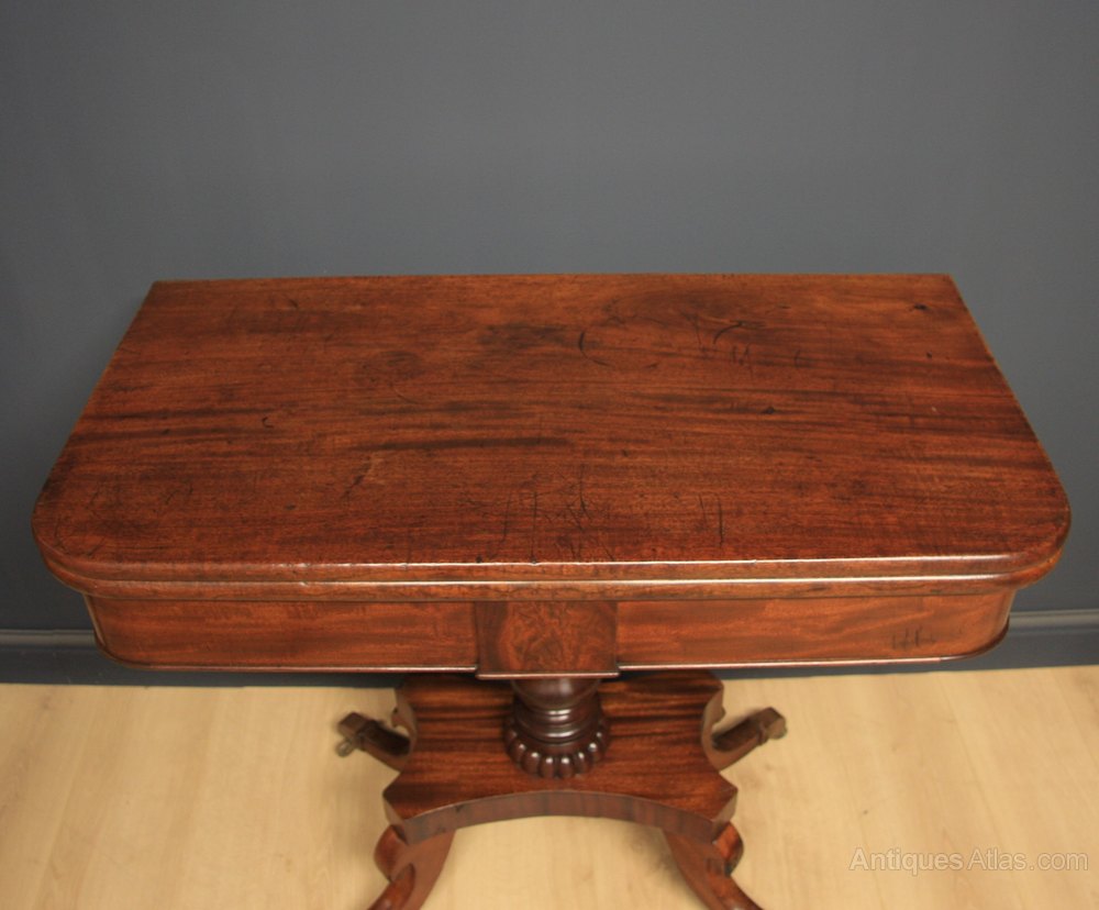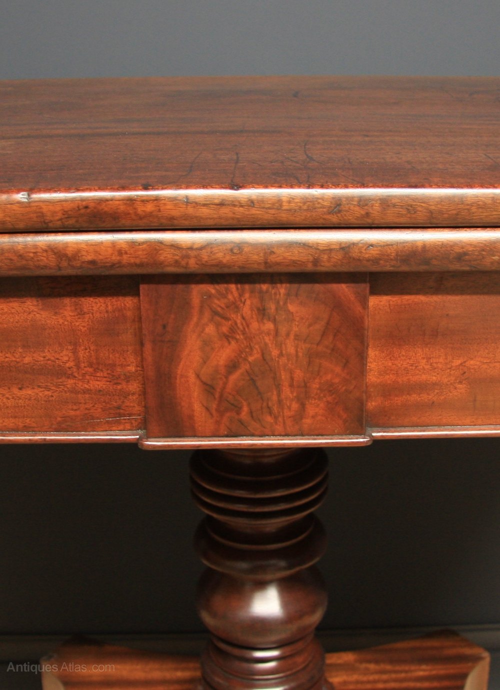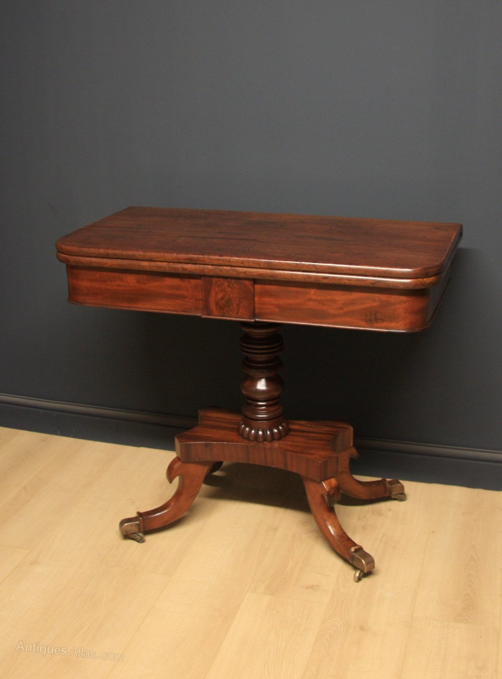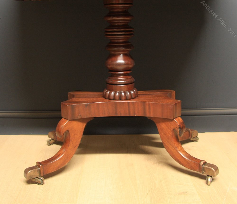 Very good quality Georgian mahogany tea table having solid figured top that opens to extend table top surface over plain frieze with flamed mahogany centre over turned pedestal with gadrooned collar and platform base with shaped sabre legs and original castors.