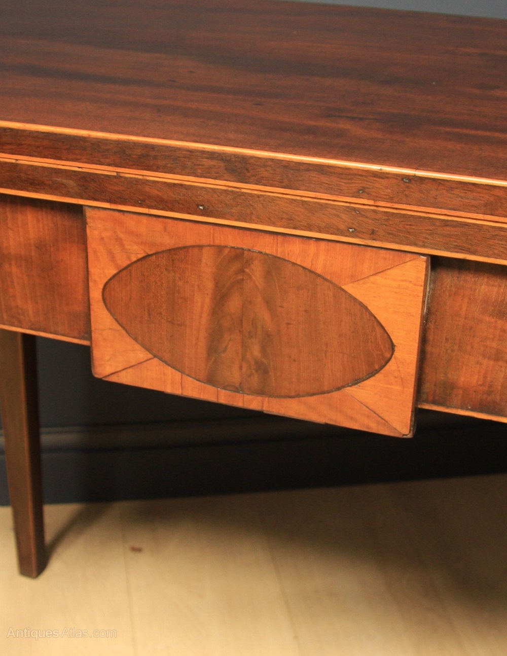 Good quality Georgian mahogany tea table having solid figured top with inlaid string around the edge that opens to extend table size over plain frieze with central section having oval shaped figured mahogany and satinwood crossbanding all standing on square tapered legs with stringing.
