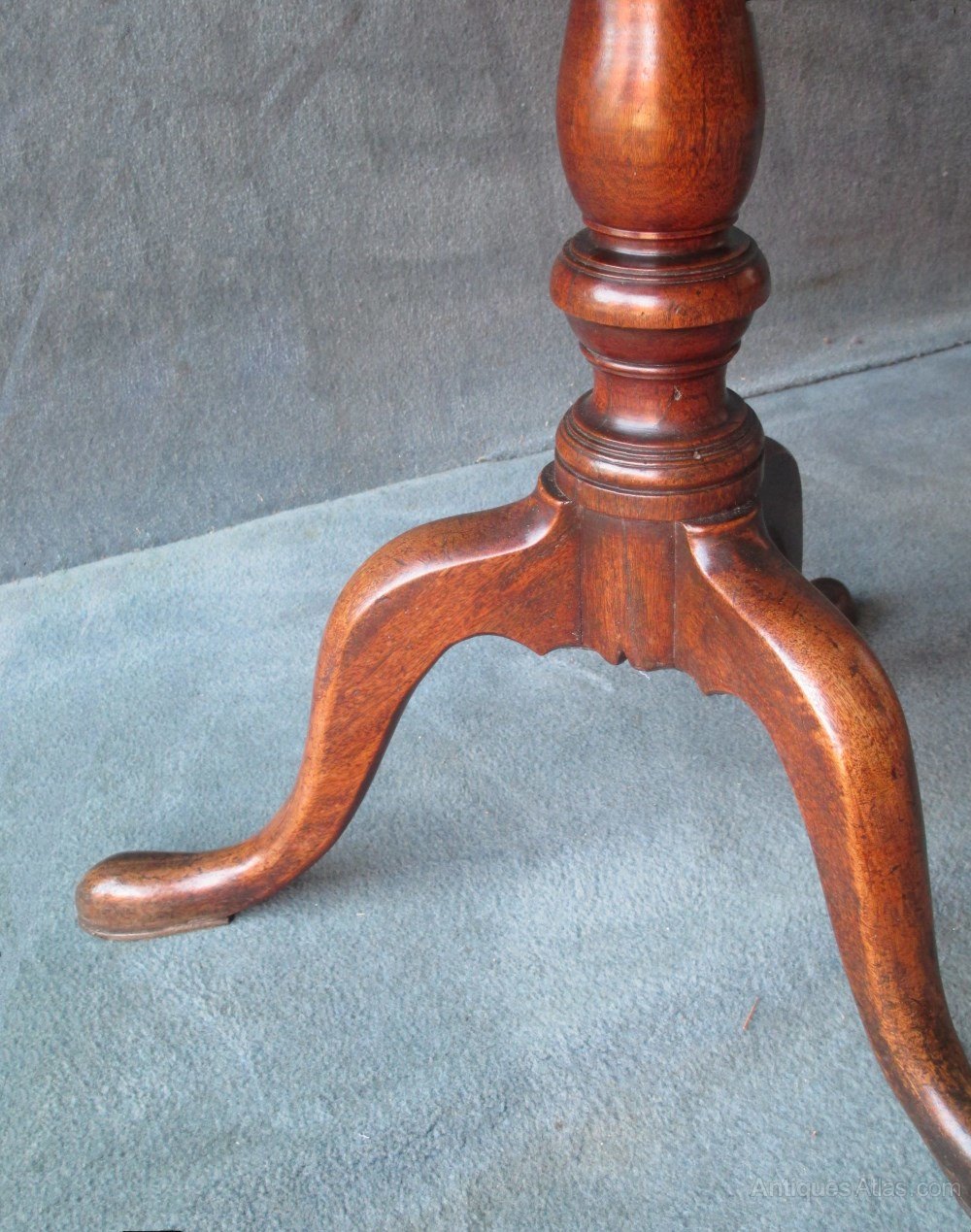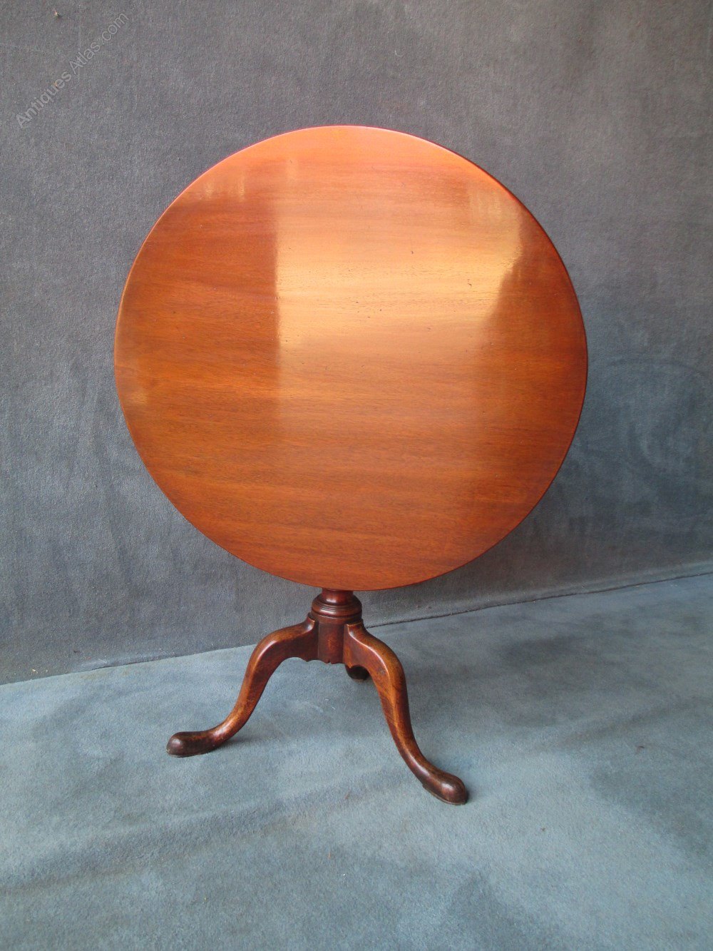 A super quality tilt top tripod table. Made from good mahogany. The centre column is turned with a vase shape with the 3 legs jointed in and finishing in a pad foot. The top has a historical split that has been “butterflied” on the underside to prevent it getting worse. The whole table has a good finish and colour