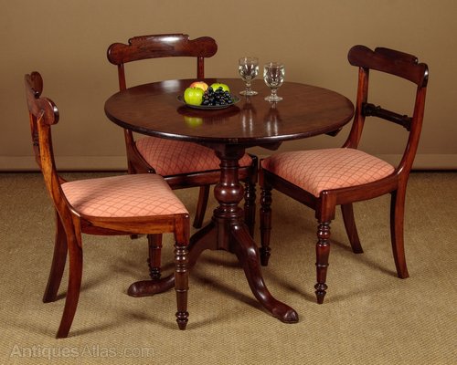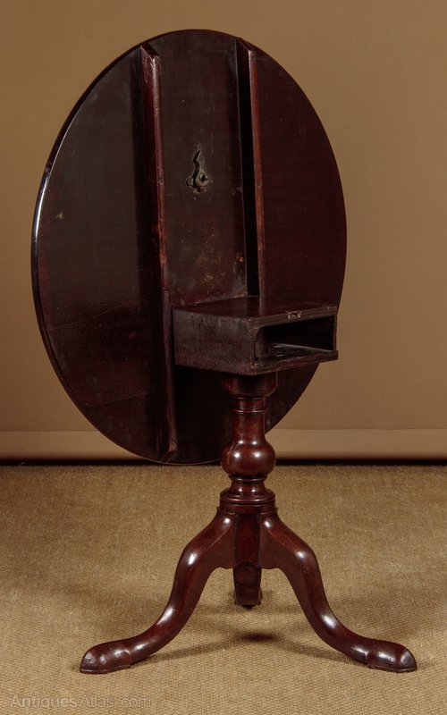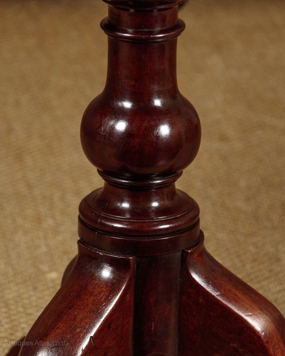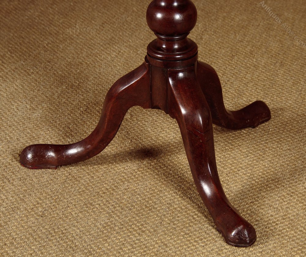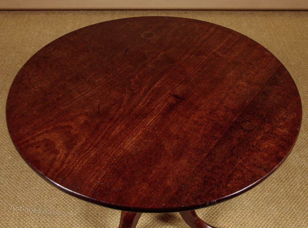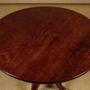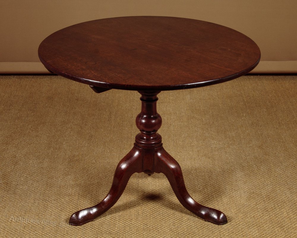 Good sized George III mahogany tripod supper table c.1800. 34″ diameter solid mahogany top with revolving action. On a bulbous turned column and sturdy tripod legs with pointed feet. Top can be tipped to vertical when not in use, locking into place with the original brass catch. Excellent colour and condition, cleaned and waxed in our workshops.