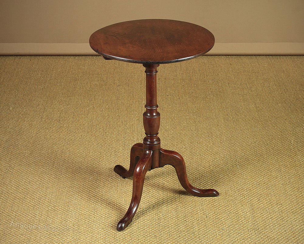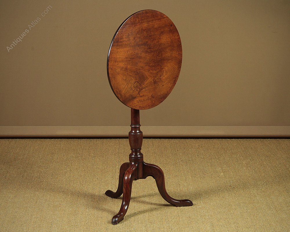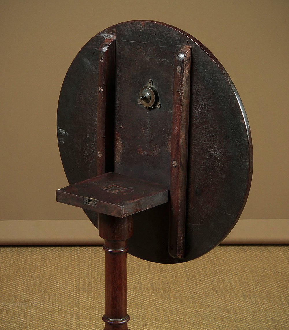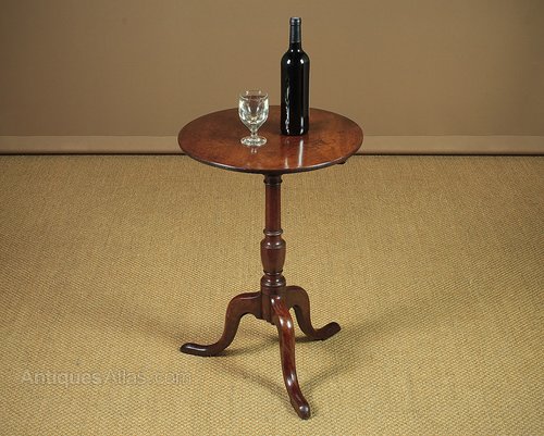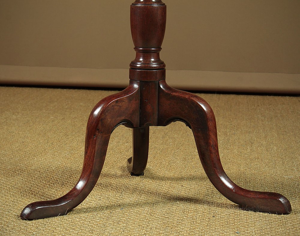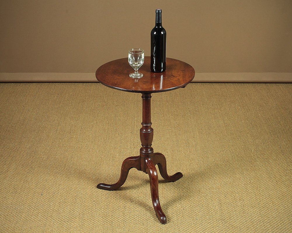 Quality example of the classic Georgian mahogany tripod wine table c.1790. 19″ diameter single piece solid mahogany top. Raised on a fine crisply turned column and shaped tripod legs. Top can be tipped to vertical when not in use locking into place with the original brass catch. Excellent original colour and condition, with some minor marks to the top, cleaned and waxed in our workshops.
