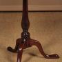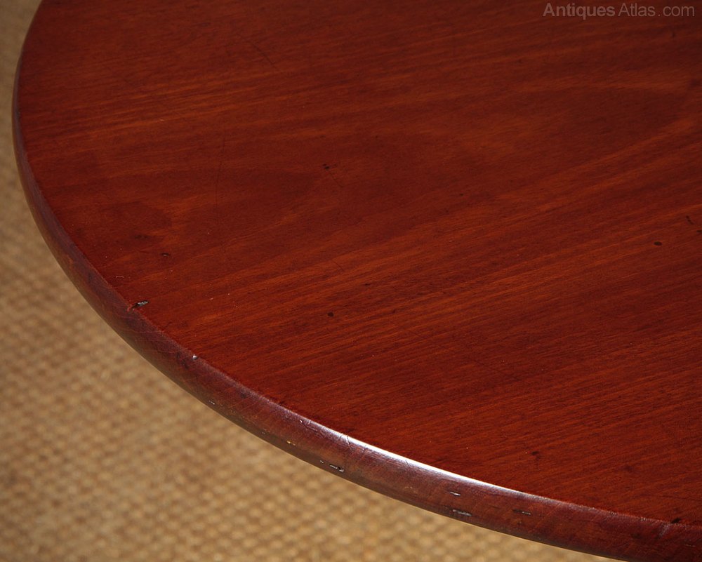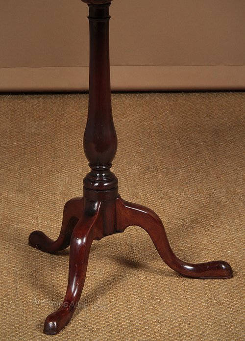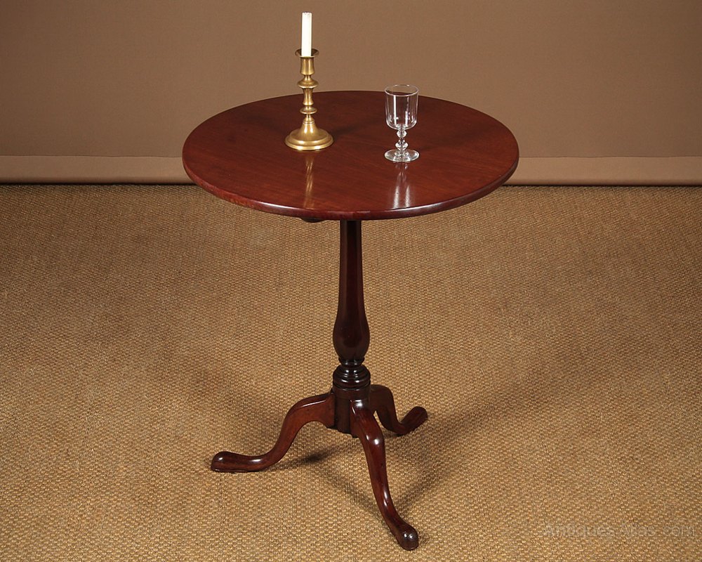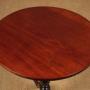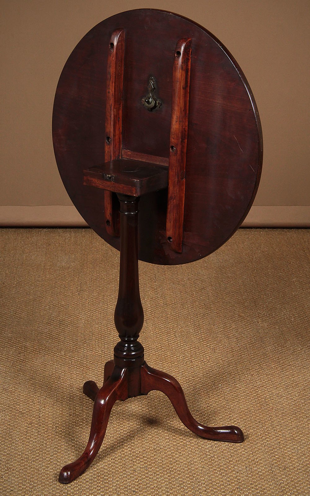 Elegant little George III tripod side table in solid mahogany c.1800. 24″ diameter top raised on a slim turned column and shaped tripod legs. Top can be tipped to vertical when not in use, locking into position with the original brass catch. Repairs to two of the legs otherwise excellent condition, cleaned and waxed in our workshops.