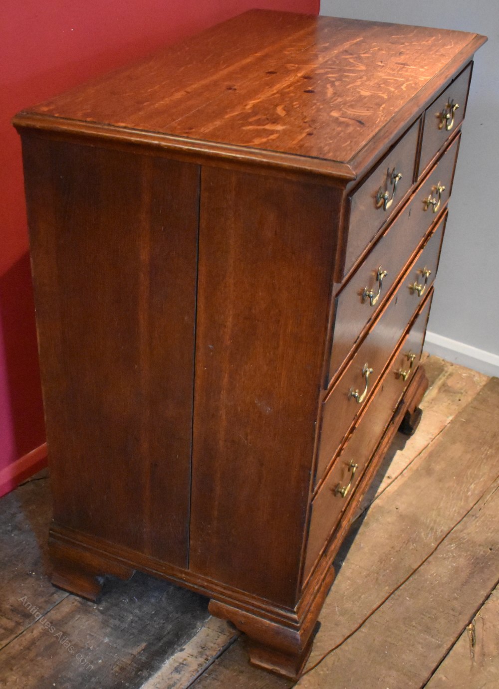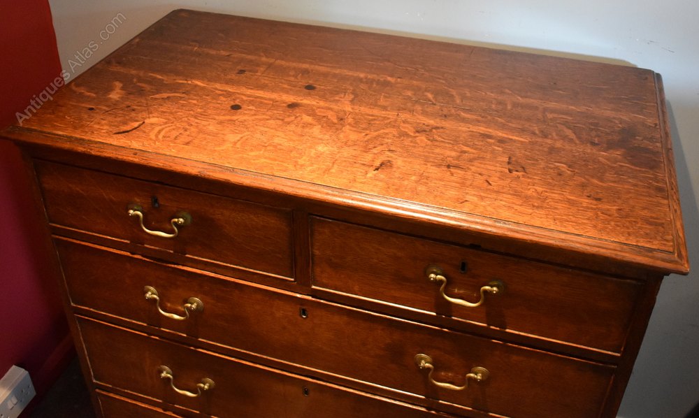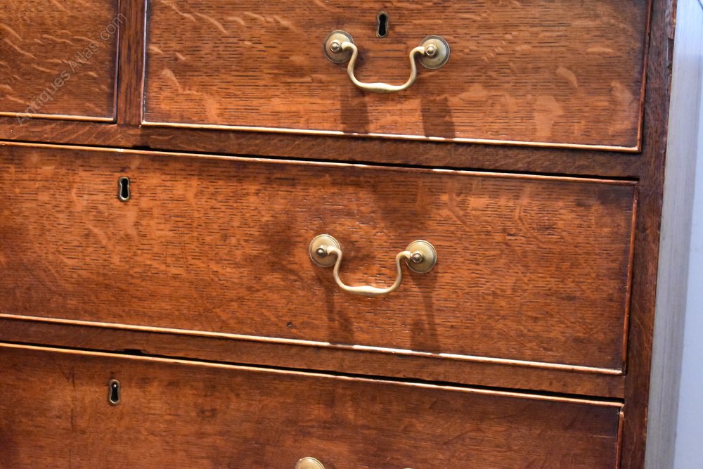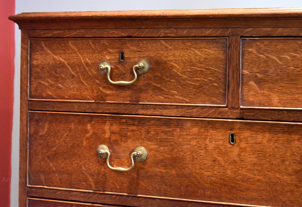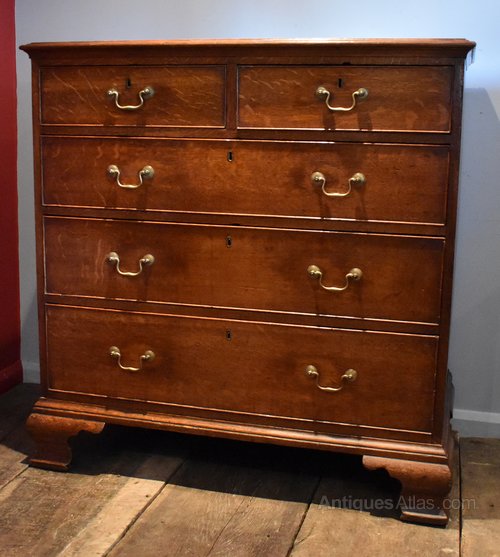 Georgian period oak chest of drawers. The chest is of finely figured oak with wonderful ogee curved feet. The chest retains a good original patina and colour. The handles are later and it has had knobs at some point, though the holes have been well repaired and are difficult to see. The drawers are all oak lined and slide easily. The chest is of a good usable size and stands very well. C.1780.