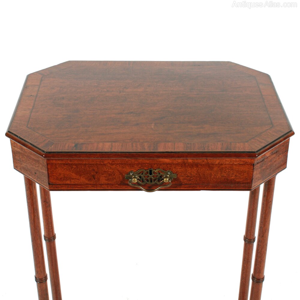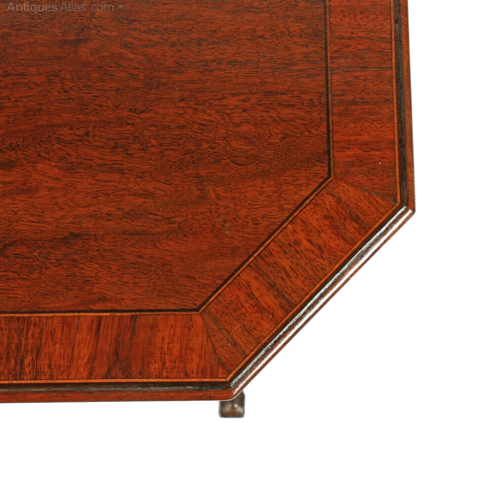 The table has an oblong top made from 'Plum Pudding' mahogany, with cut corners and a broad rosewood cross banding that is straddled with line inlays.
