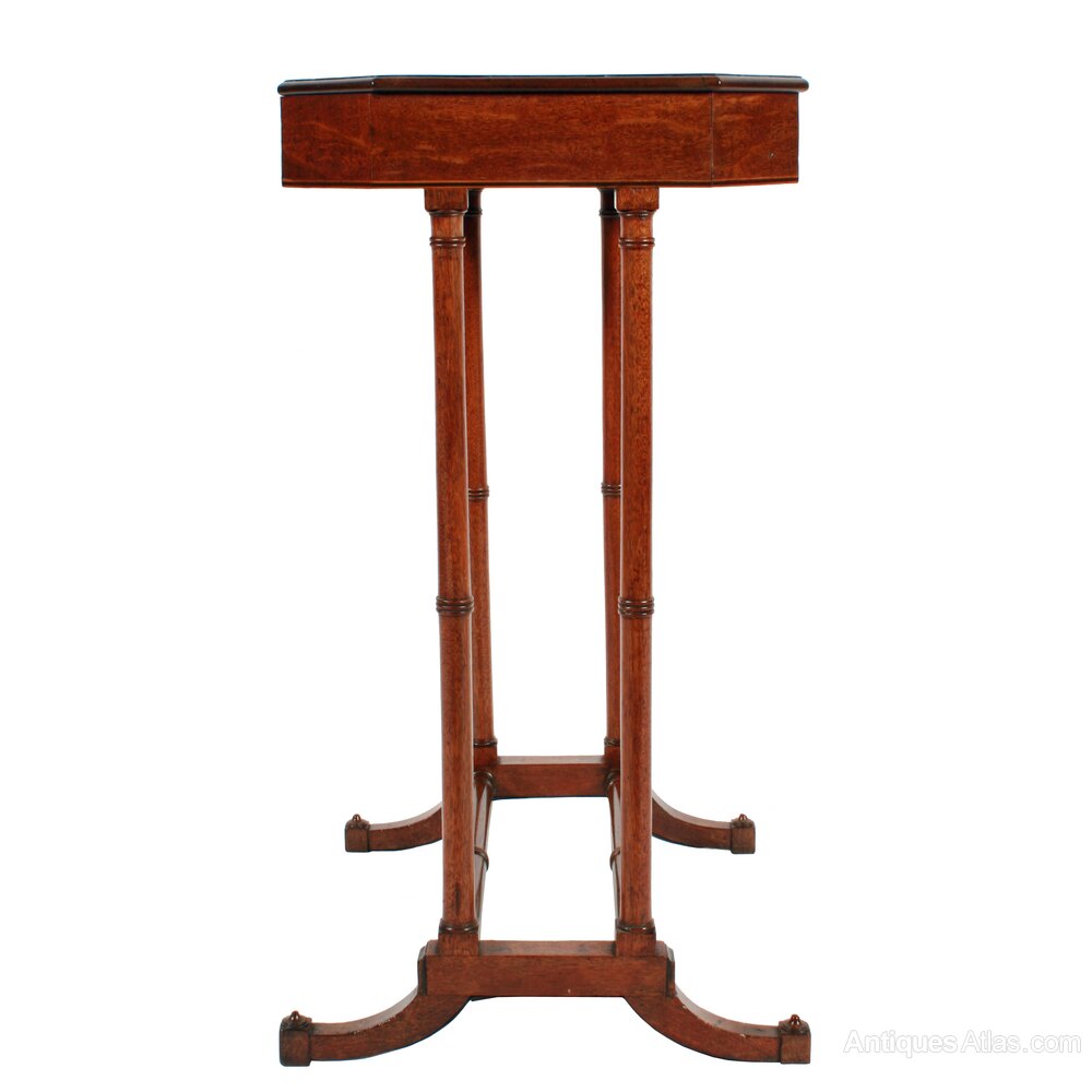 The table top is supported on four slender turned mahogany legs that stand on a pair of platforms with matching cross rails.
