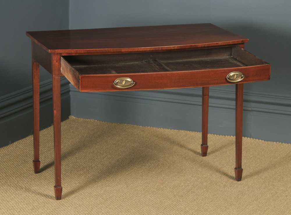 Here is a fine quality antique English Georgian Regency mahogany bow front side table, circa 1820, displaying a lovely rich colour, in good original condition. The table features a single plank bow front top with satinwood string inlay to the perimeter. Below, is a single flush working drawer. The drawer displays satinwood string inlay to the front, as well as retaining the original foliate oval brass handles & escutcheons. The oak-lined drawer is constructed with hand dovetail joints and runs smoothly, closing flush to the frame. The table is raised on four straight tapering block legs. The table features the original top and backboard to the rear the frame has been constructed in the traditional joined manner for that period. This mahogany side table is solid in joint and ready to use.