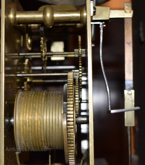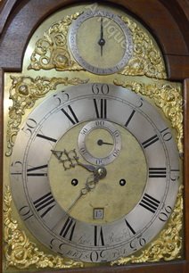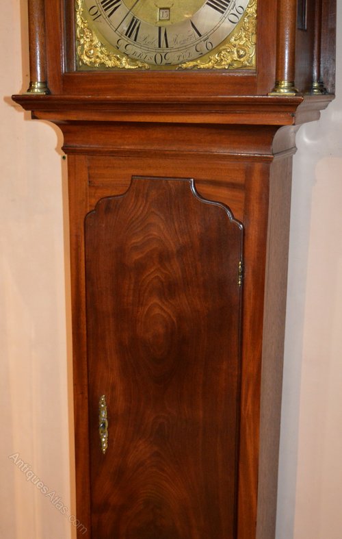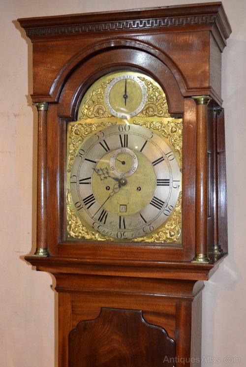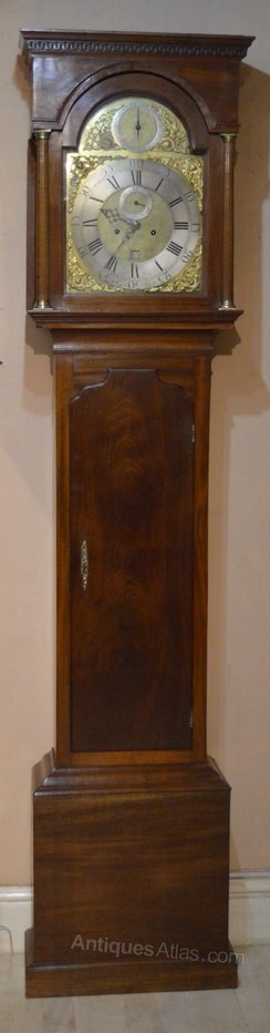 An impressive Bristol Georgian mahogany longcase clock. A flat moulded hood pediment with Greek key mouldings. Side glass hood apertures and brass capped hood columns. A long trunk door to the well proportioned case. A brass and silvered dial with date, seconds and strike/silent to the arch. An 8-day duration mechanism striking the hours on a bell.