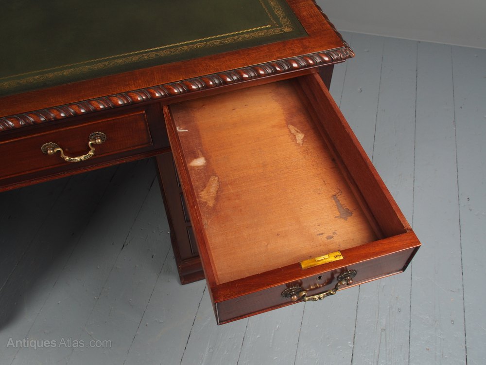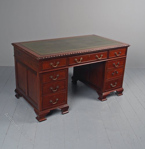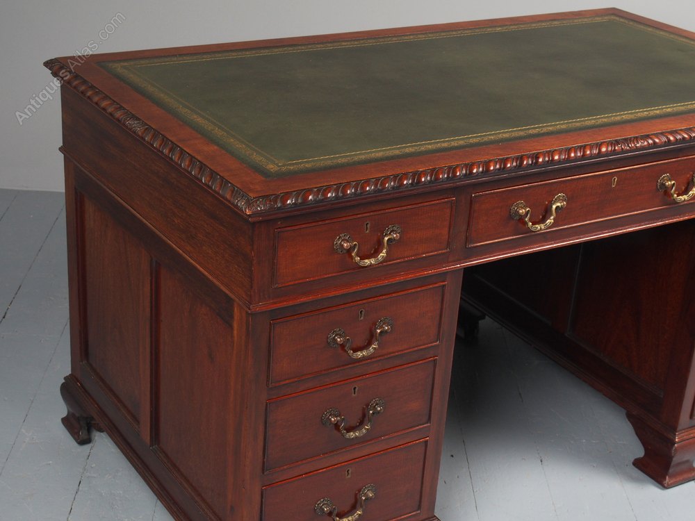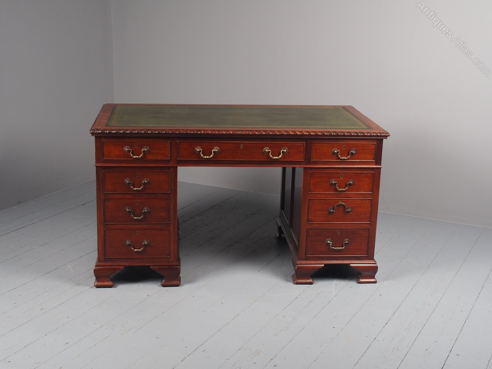 Circa 1900, Georgian style-mahogany freestanding twin-pedestal kneehole desk. The rectangular top with a gilt-tooled, green leather skiver writing surface and gadrooned edges over 3 mahogany lined frieze drawers with cast brass swan neck handles. Supported on banks of 3 graduated drawers over a neat moulded base and ogee bracket feet.