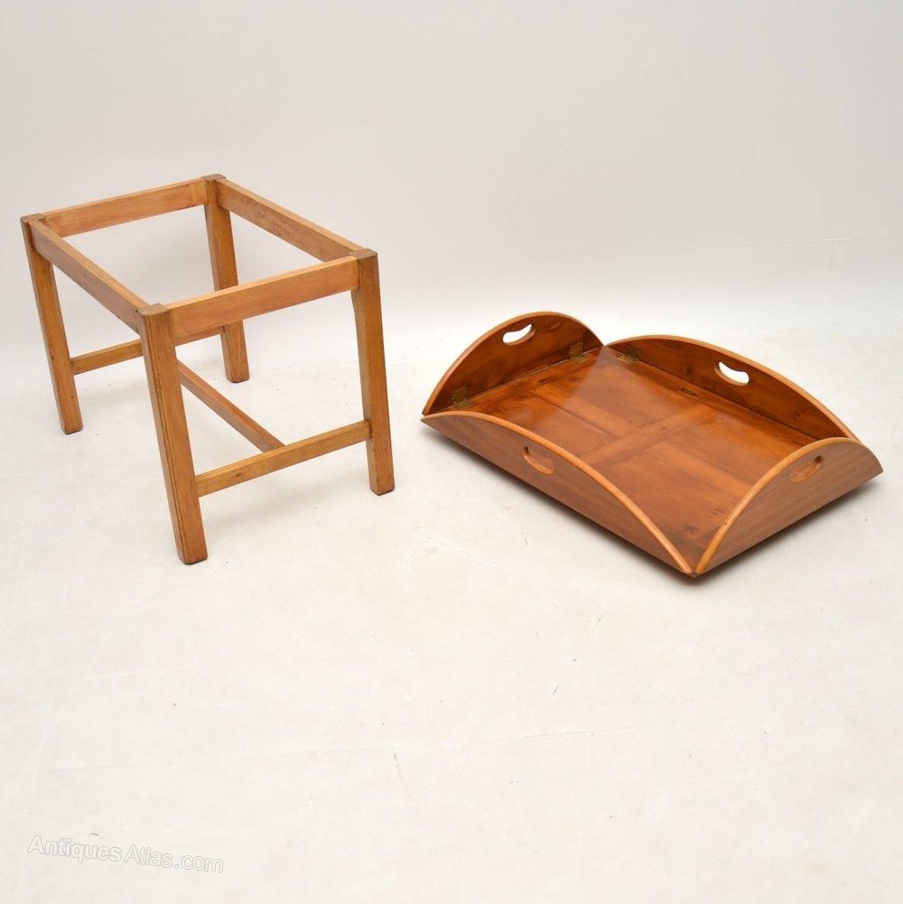 This yew wood butlers tray coffee table is in lovely condition & dates to around the 1950’s period. It’s antique Georgian style, very well made & has just been French polished. I like the fact that the top tray section detaches & also the way that the flaps can be lifted up when not in use, so taking up a lot less room. The figuring on the top has a lovely pattern & the base section has cross stretchers between the chamfered legs. The measurements below show for both open & closed.