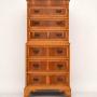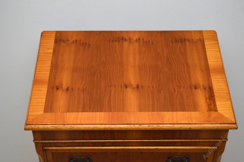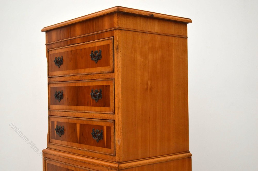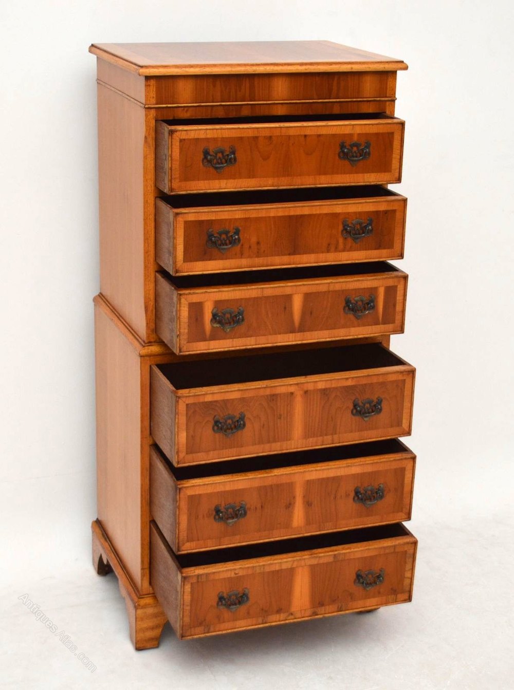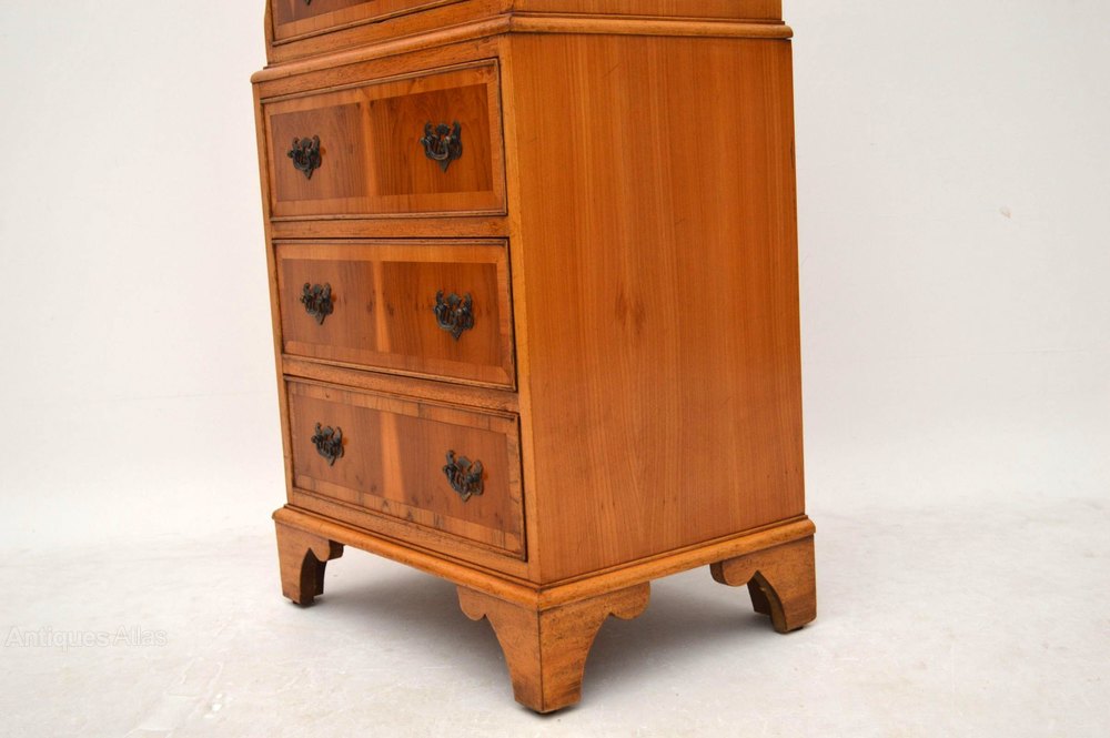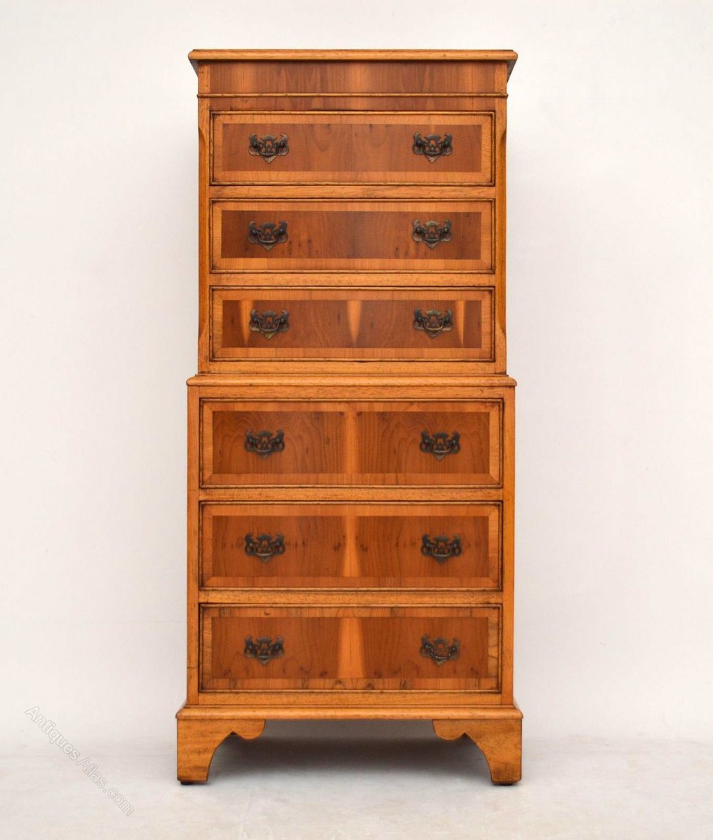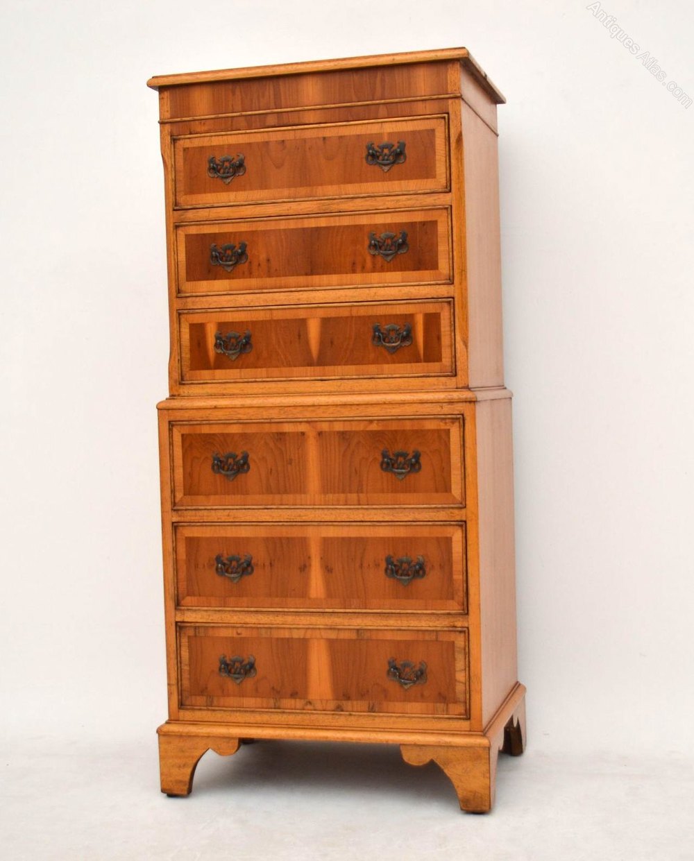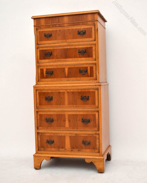 Antique Georgian style yew wood chest on chest in lovely original condition, with a beautiful grain to the wood & it dates to around the 1930-50’s period. It has a cross banded top, 6 graduated drawers with original brass handles & sits on bracket feet. The drawers are also cross banded & the top section has chamfered corners. This piece has just been polished, so it’s in good condition & has a lovely colour.