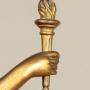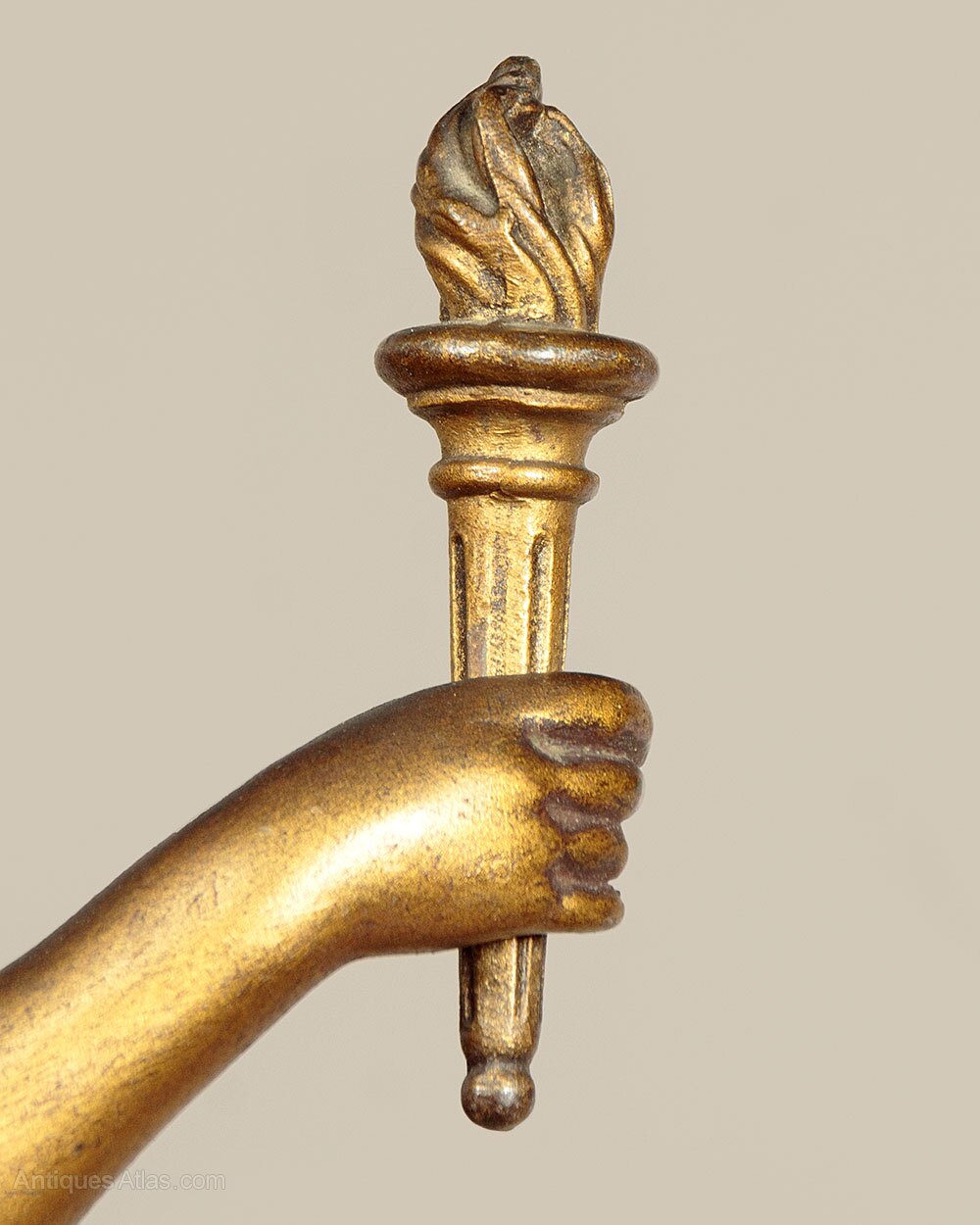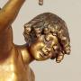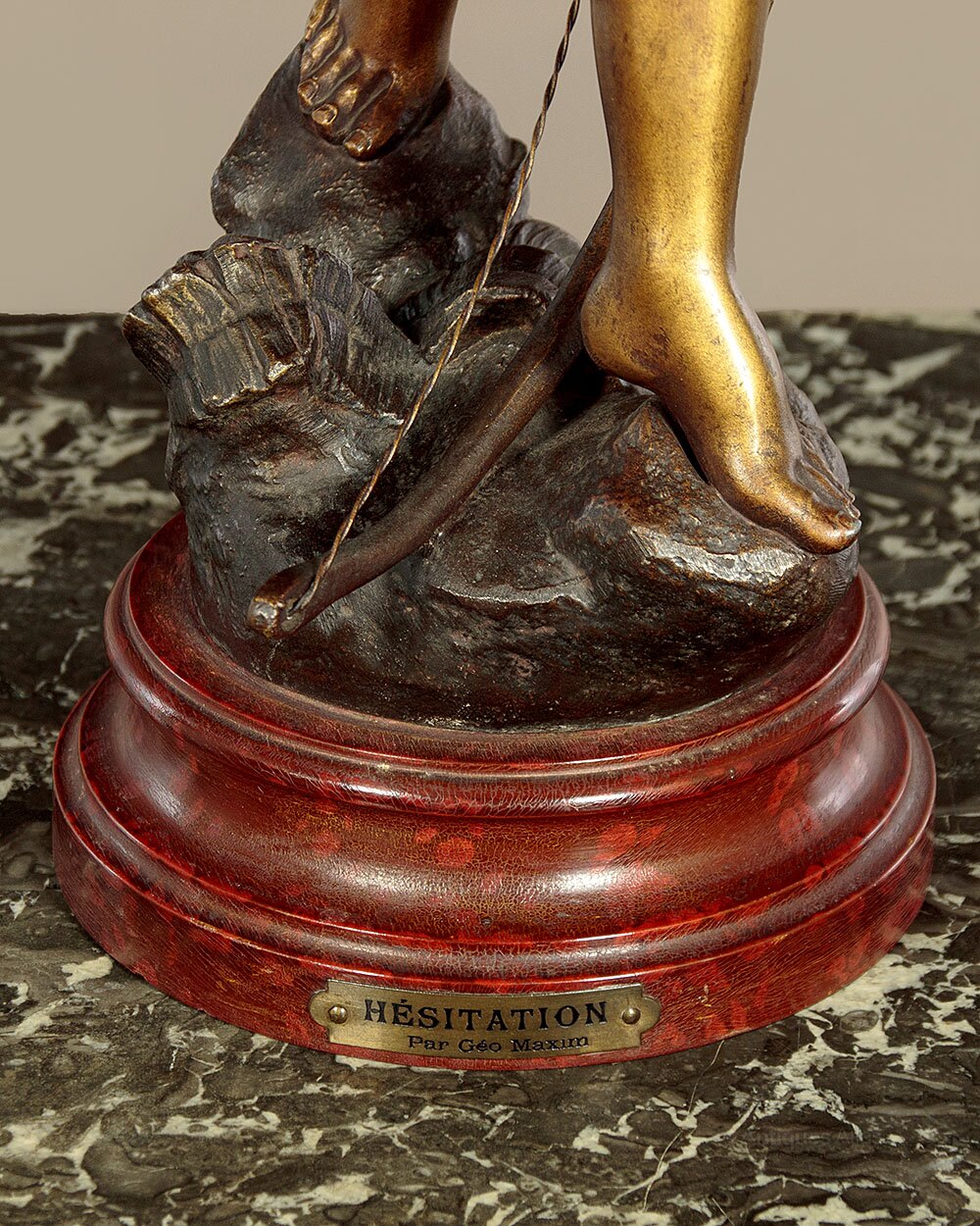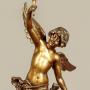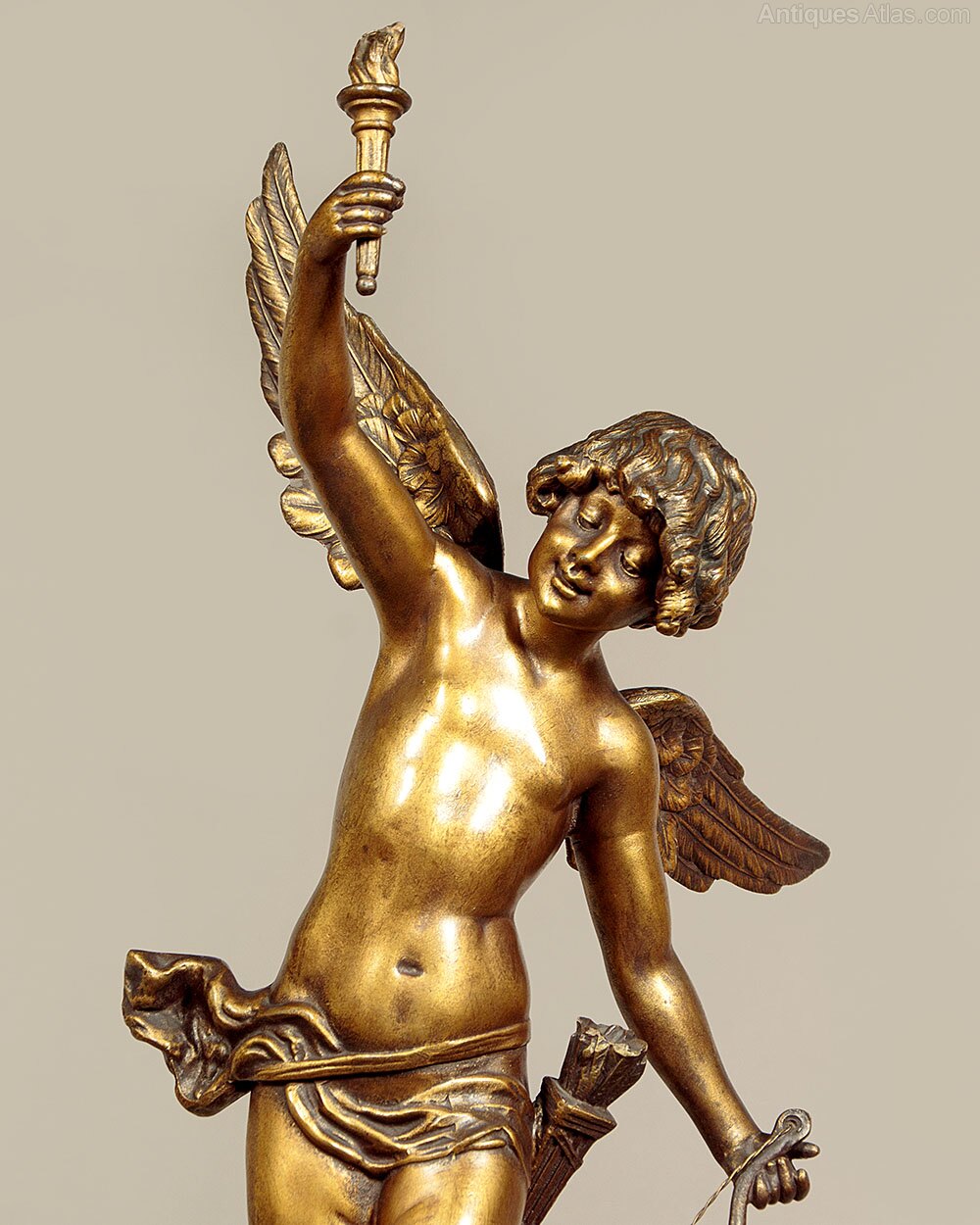 Good figure of a young male winged angel, presumably Cupid, carrying a bow and a quiver of arrows and holding aloft a flaming touch. After the French sculptor George Maxim (1885-1940). Standing 24½" tall. Very nicely cast in spelter with original mellow gilt finish. Raised on a 5½" diameter turned and painted wooden base with a brass plaque inscribed 'Hesitation par Geo Maxim'. Very good condition.