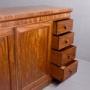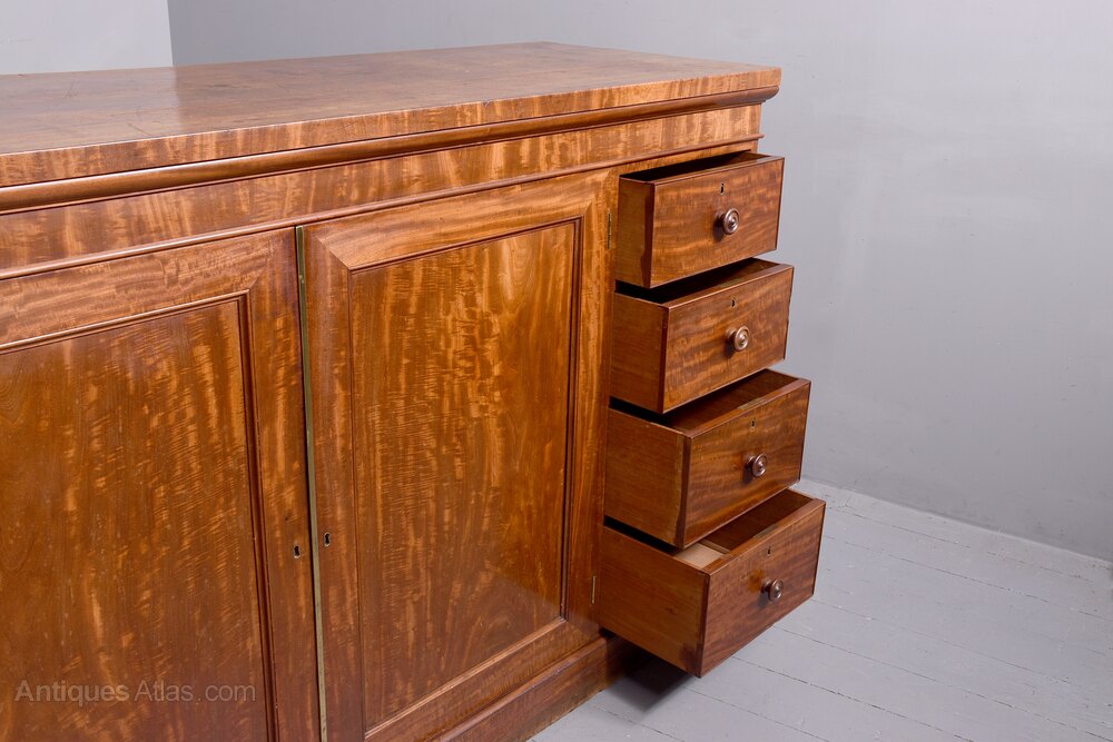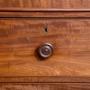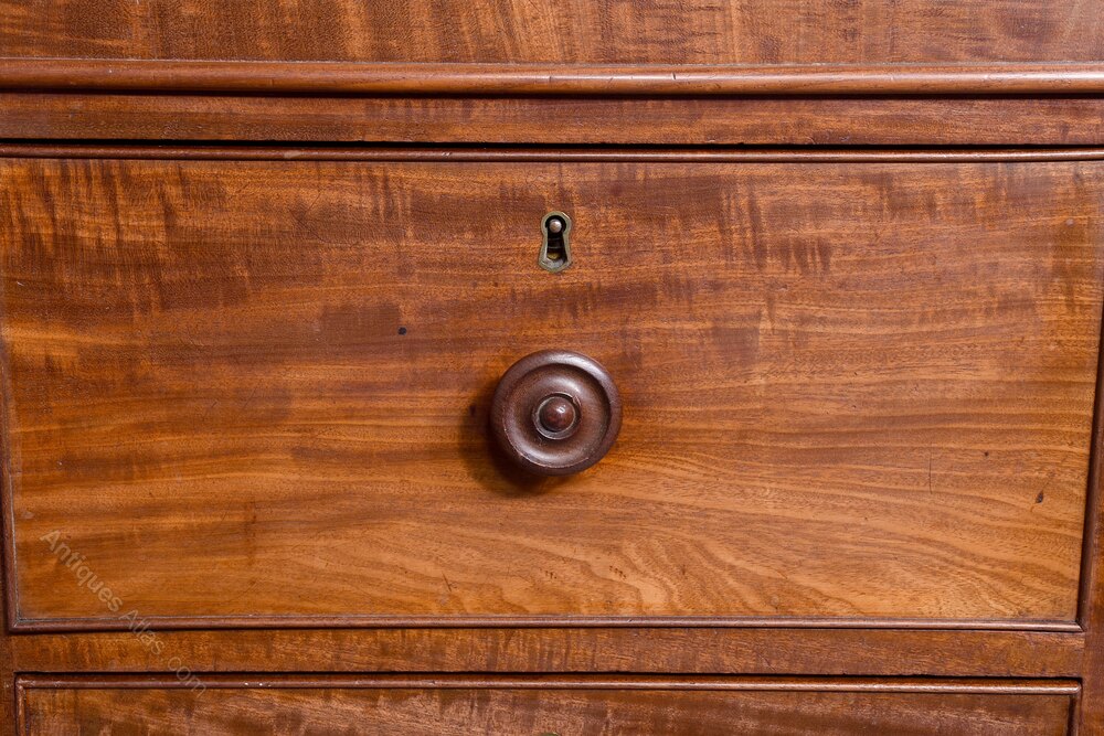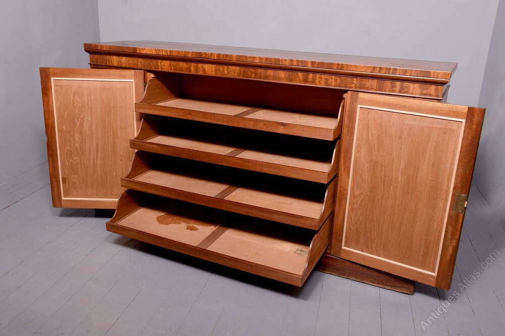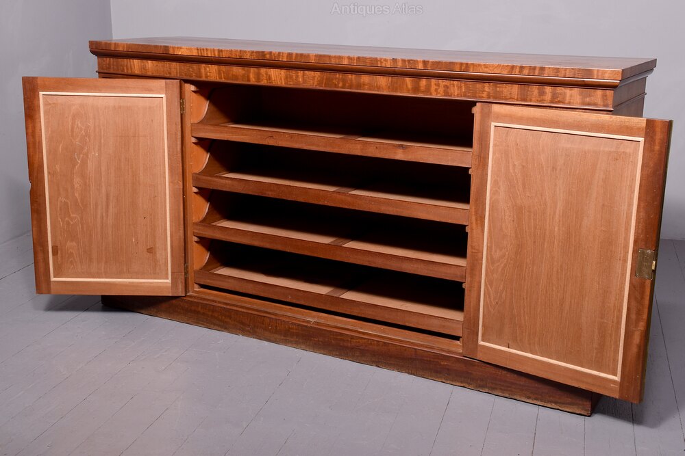 CIrca1820. George IV mahogany low linen press/chest of drawers, probably by ‘Gillows of Lancaster’, the top in finely flamed mahogany with simple flat fore-edge, stylish moulding and beaded frieze. The centre with a pair of doors in flame mahogany with brass beading, open to reveal four removable trays flanked by a bank of four drawers each with cock beading, oval escutcheons and a turned handle, all the locks are stamped’ J. Child’, the quality is superb with the drawers made in mahogany and walnut.