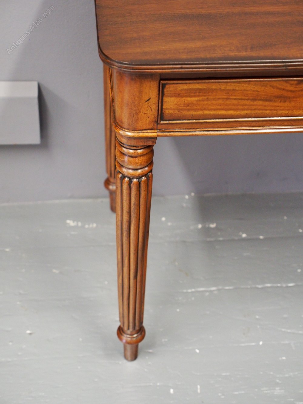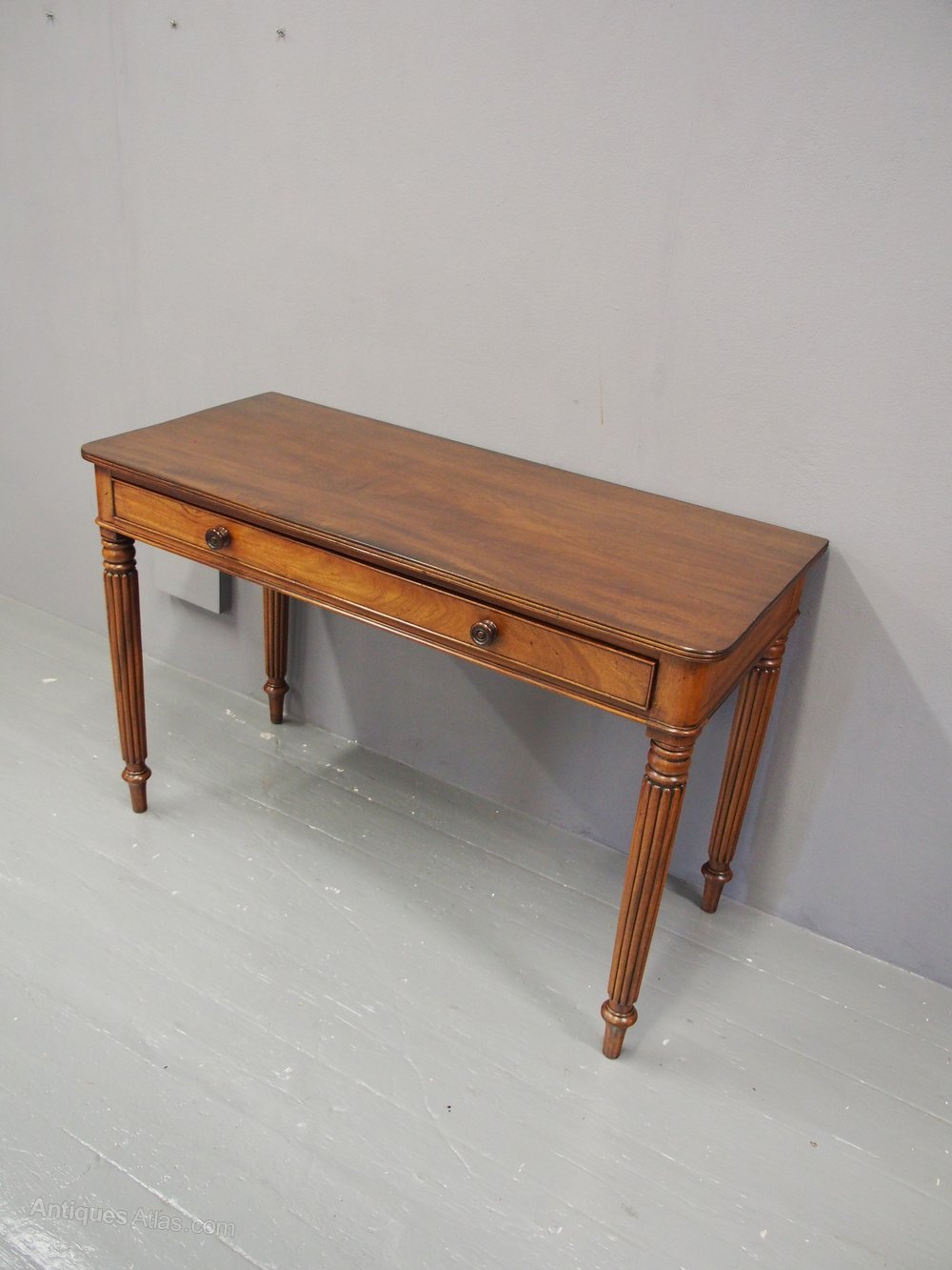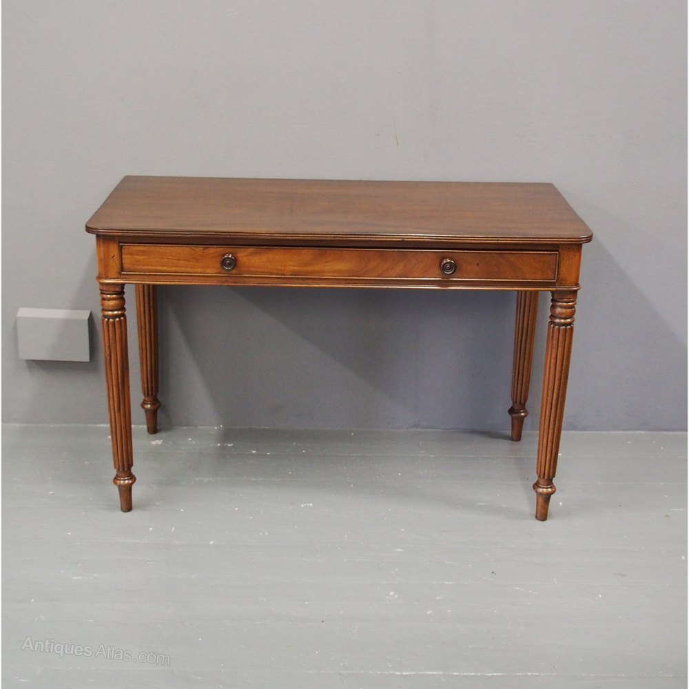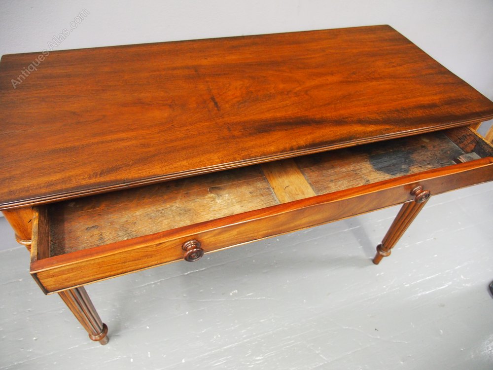 Circa 1850, Gillows style mahogany side table or writing table. The rectangular top in figured Spanish mahogany with rounded corners and fluted fore-edges is over a full-length cock-beaded, oak-lined frieze drawer with finely turned knobs. It is all supported on classical Gillows’ tapering fluted legs over turned toes.