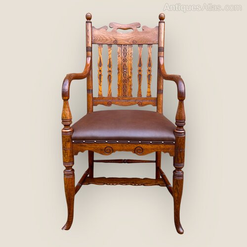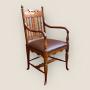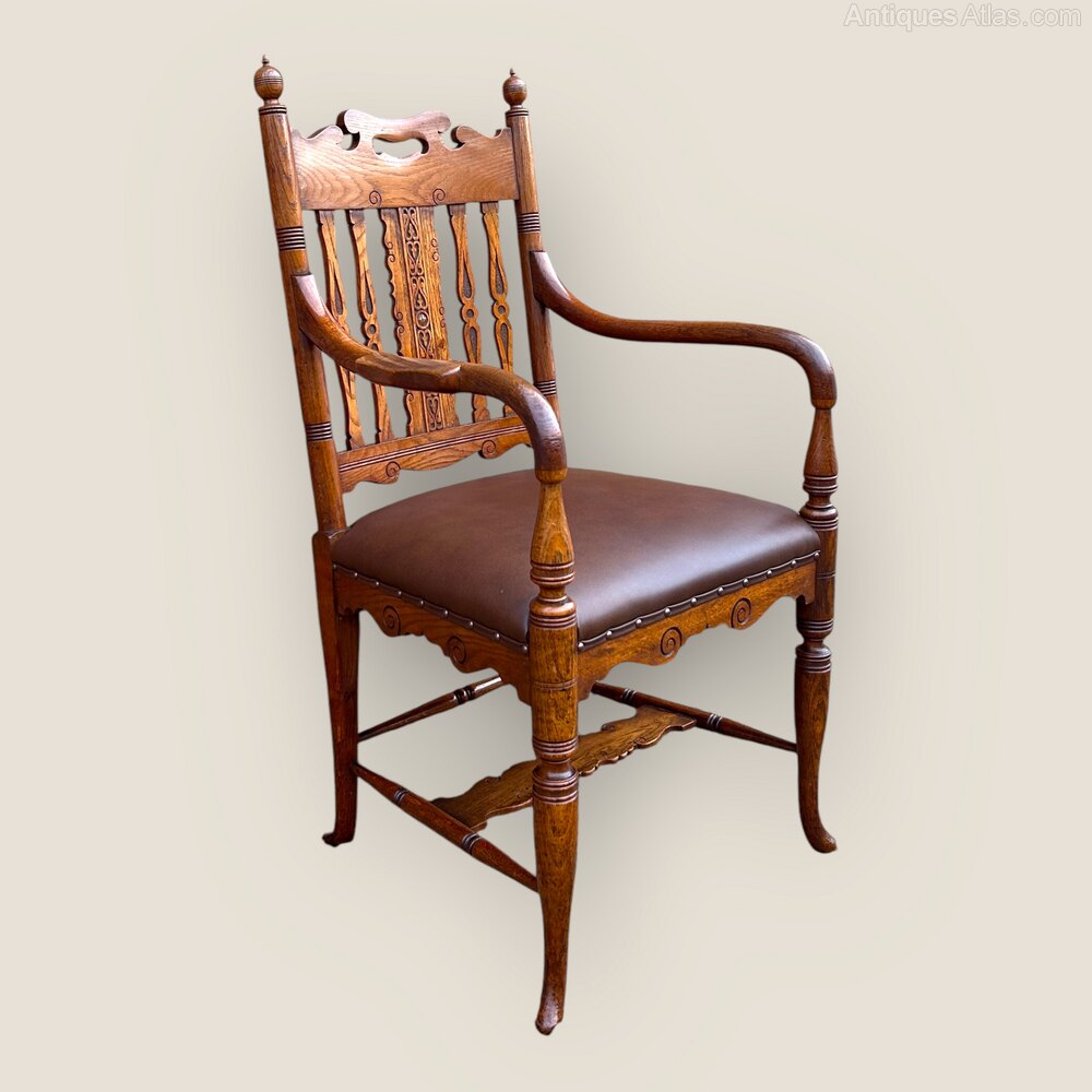 A Gillows Late Victorian Golden Oak Desk Chair attributed to Bruce James Talbert. This fine chair has a carved back with detailed geometric designs, turned legs, a carved finial on top of both sides, a great condition upholstered brown seat and carved detailing throughout.