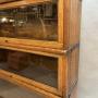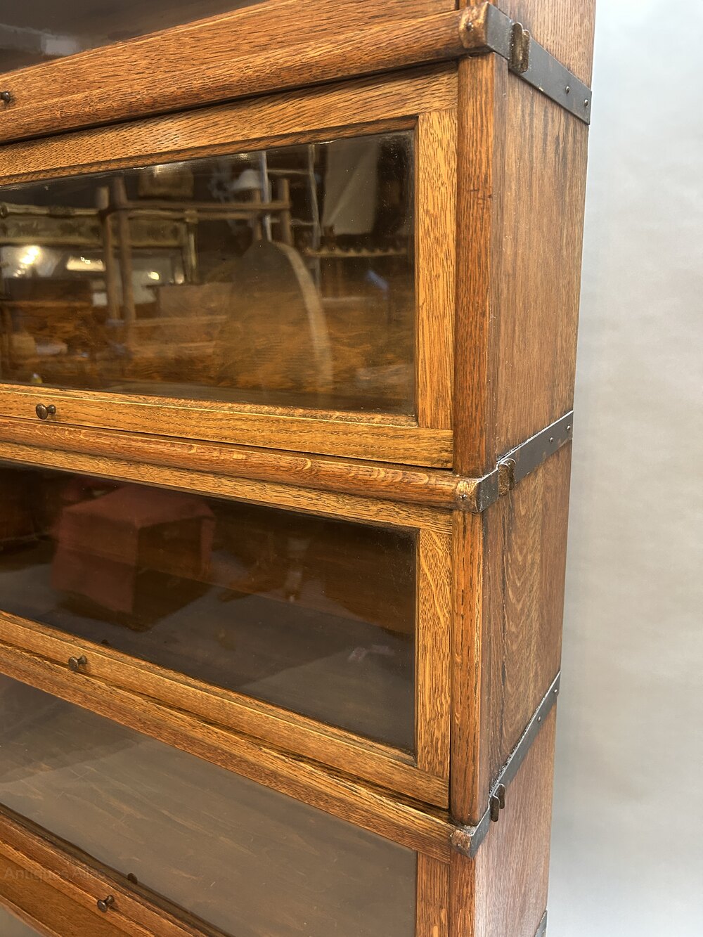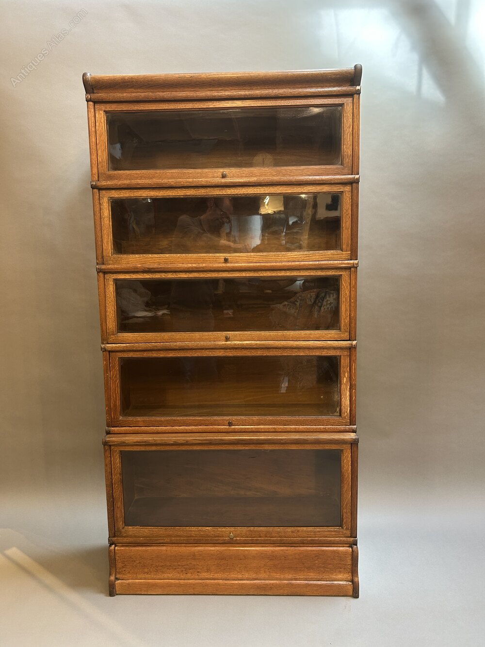 Early C20th oak of good colour and figure, comprising cornice over 5 graduated sections of up & over doors raised on plinth base.