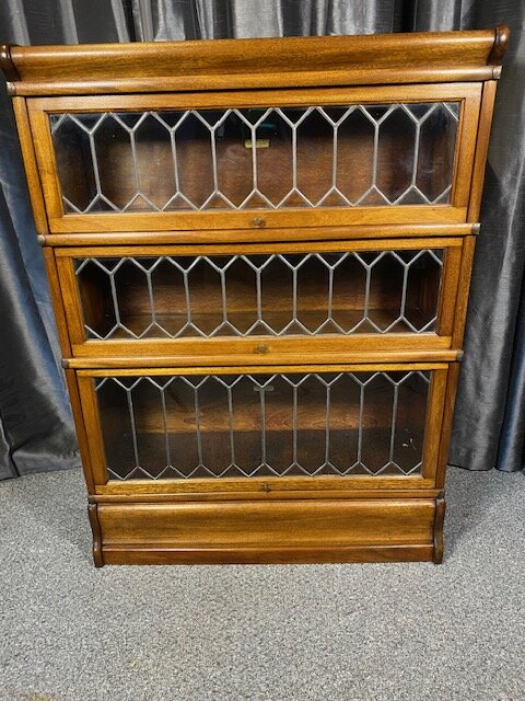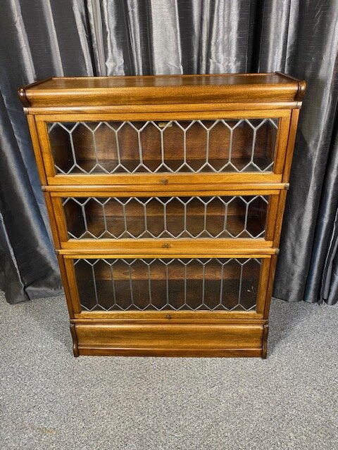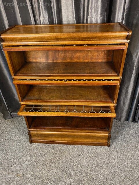This very practical Mahogany Globe Wernicke style bookcase is ideal for smaller spaces , it has three lift up glass fronts with shelves for your books or collectors items all in a light honey colour .
