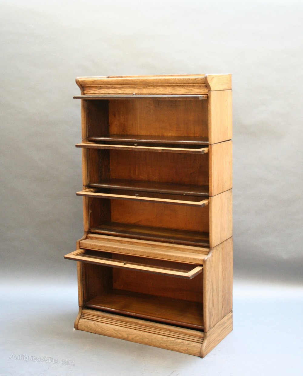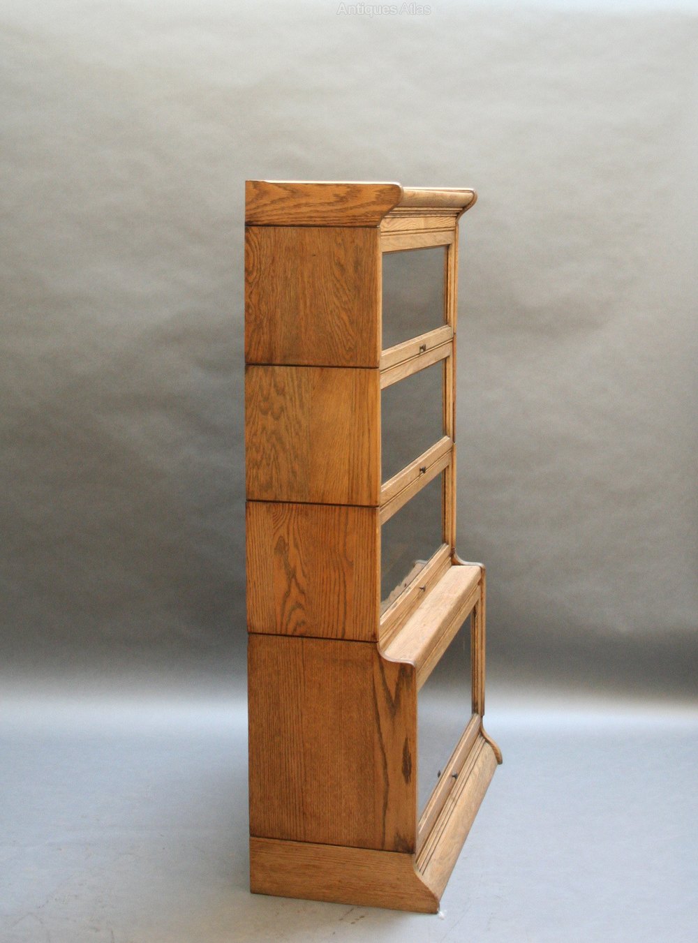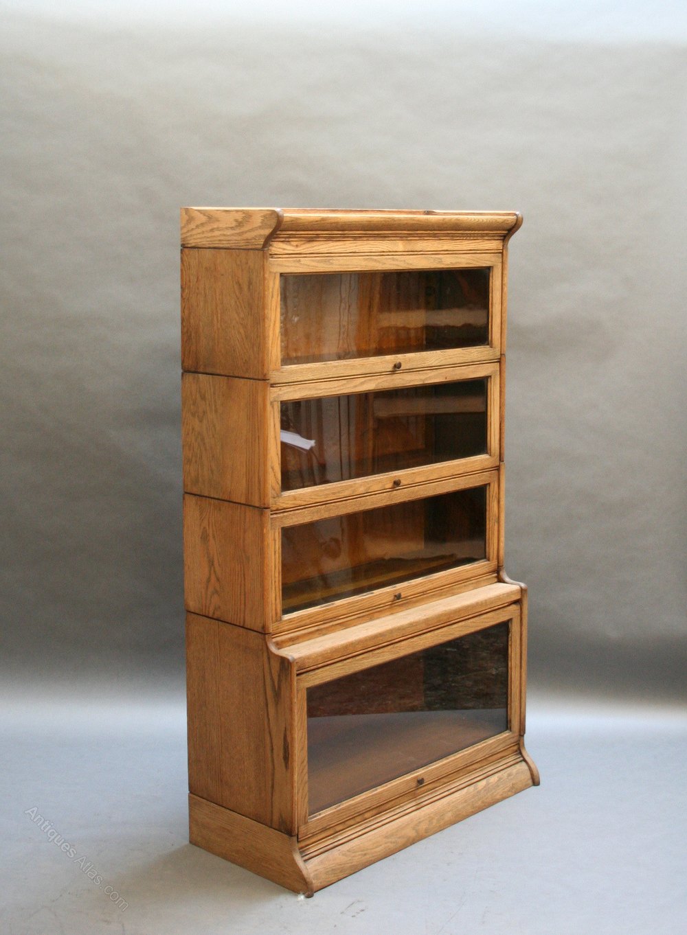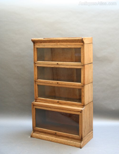 early C20th pale oak bookcase comprises 4 sections with up and over glazed doors, cornice top and plinth base.