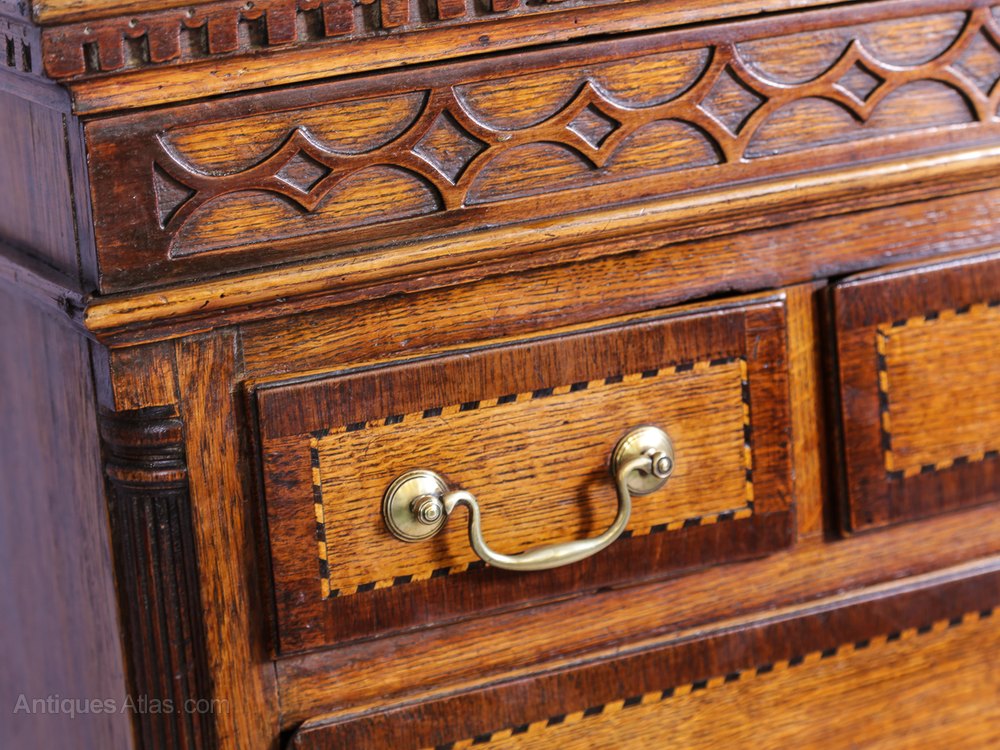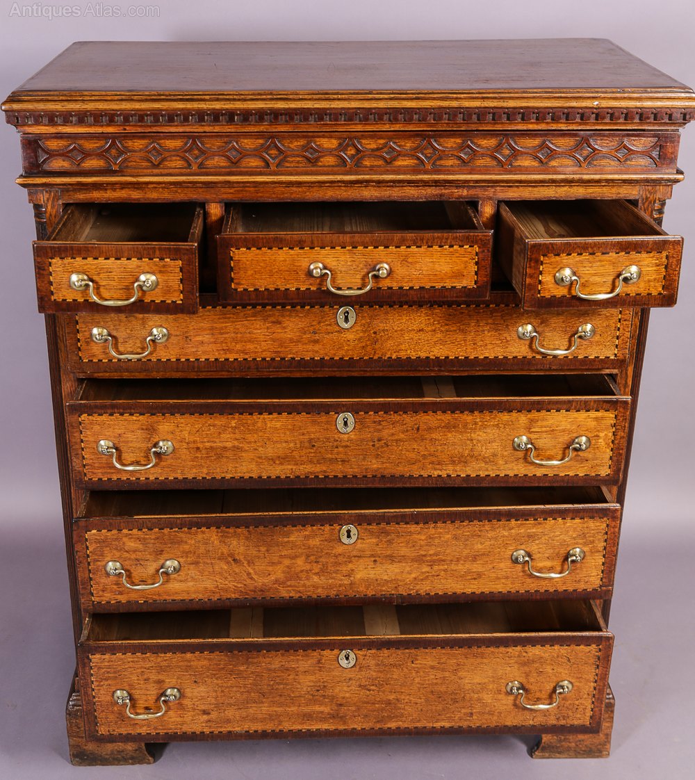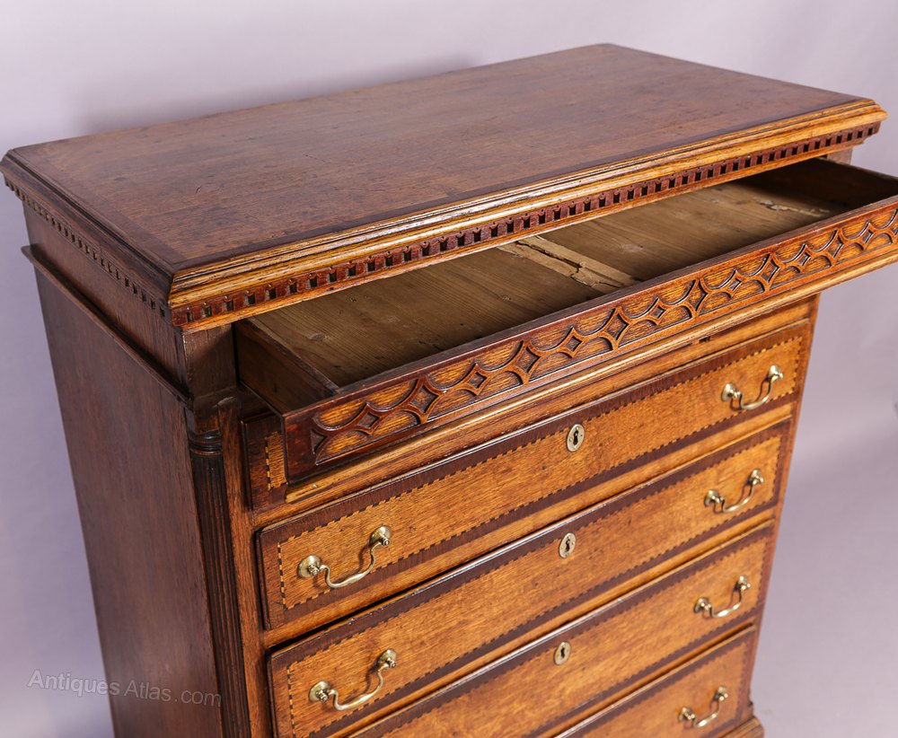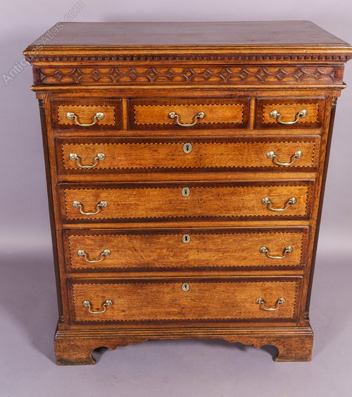 A Really attractive 18th century Chest of Drawers in Oak with cross banding of Mahogany and string inlay of Ebony and Box, Three Smaller Drawers over four larger drawers the top drawer which is carved is a secret drawer, the handles are original, the bracket feet have a good shape, the canted corners are reeded, A really good chest in excellent condition.