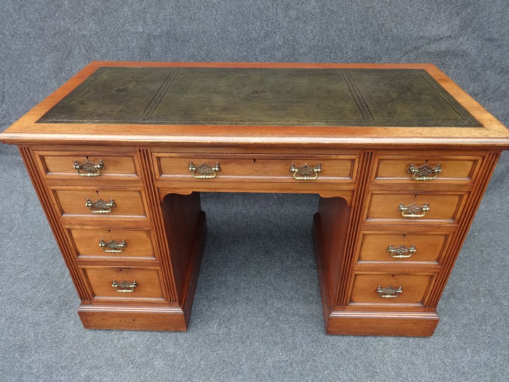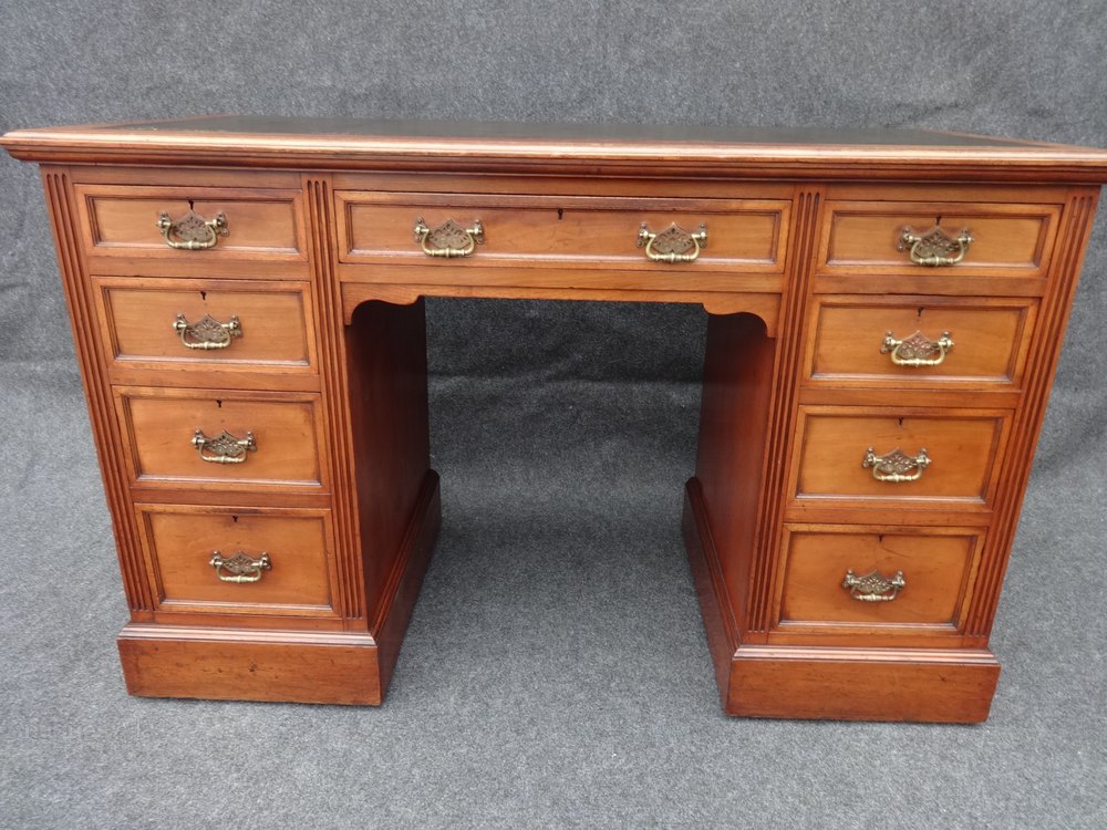 In excellent condition, nine drawer mahogany desk with replaced green leather, in original condition.