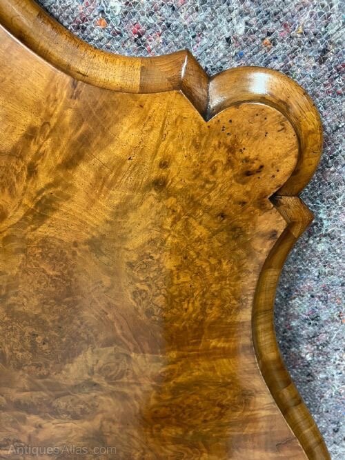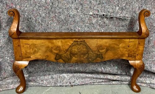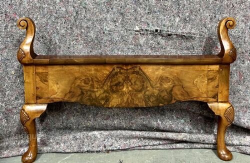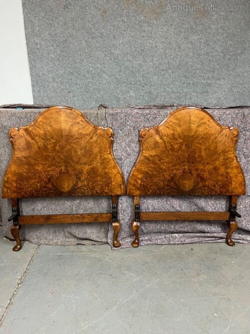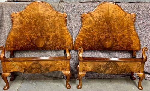 A beautiful pair of single 3ft. wide burr walnut beds in the Queen Anne style. The very elegant shaped headboards having thumb moulded cross grain edges and book matched bur walnut panels. The low footboards having Queen Anne style legs with carved shells and harebell detail, burr walnut friezes and raised cabriole arms with scrolled tops. The beds are supplied with slatted mattress supports and side irons. All they need are 2 three foot mattresses and a spanner to assemble. Dimensions:- Headboard Height… 55’'/ 140 cm. Footboard Height... 26’’/ 66cm. Maximum Width…41’’/ 104cm. Maximum Length…80’’/ 203cm.