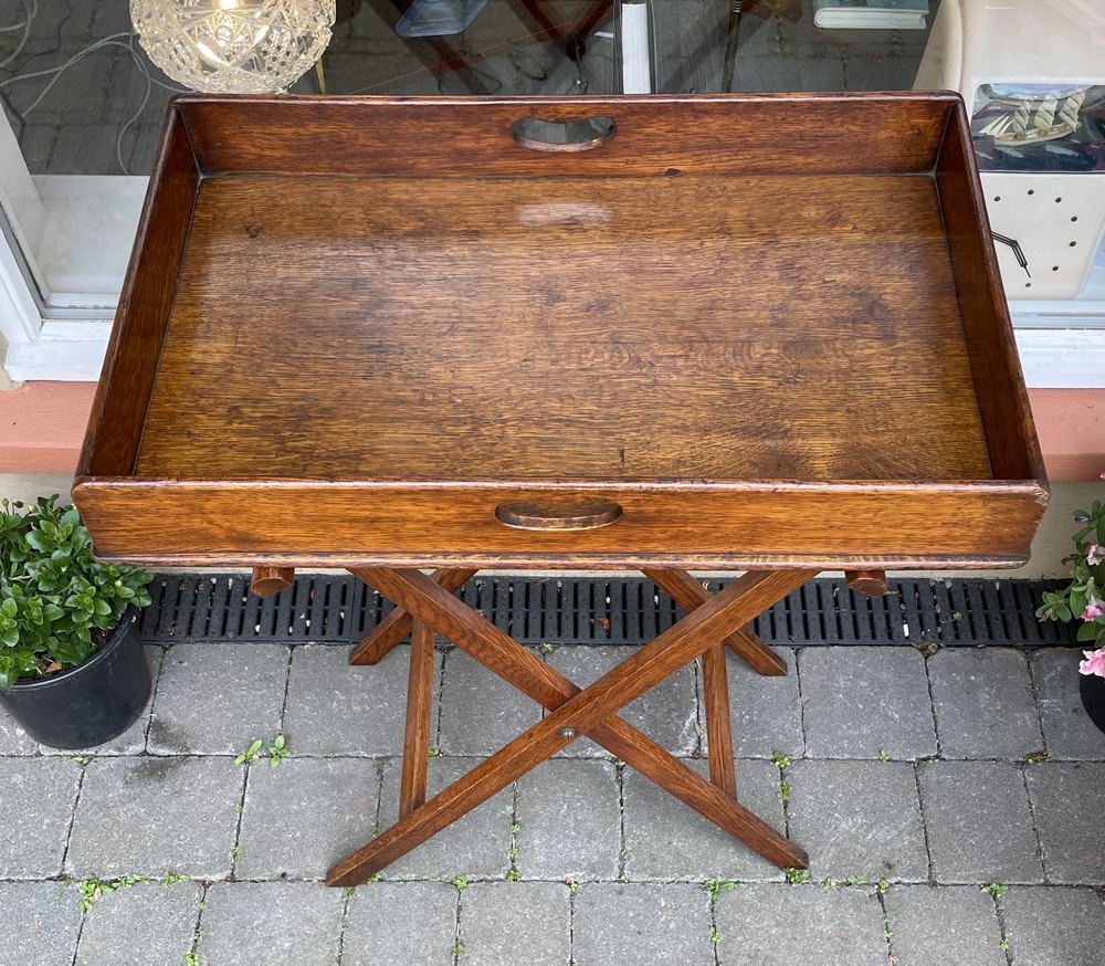 A good quality late Victorian oak butlers tray on stand, of excellent colour and undamaged condition. Circa 1900.