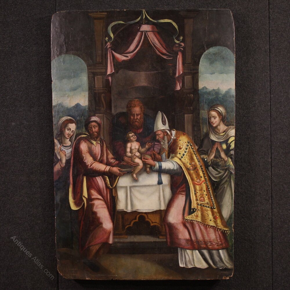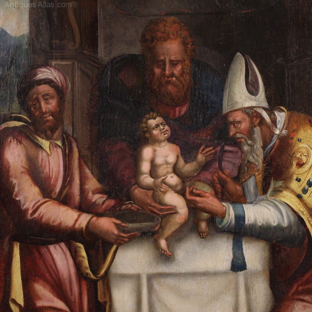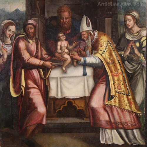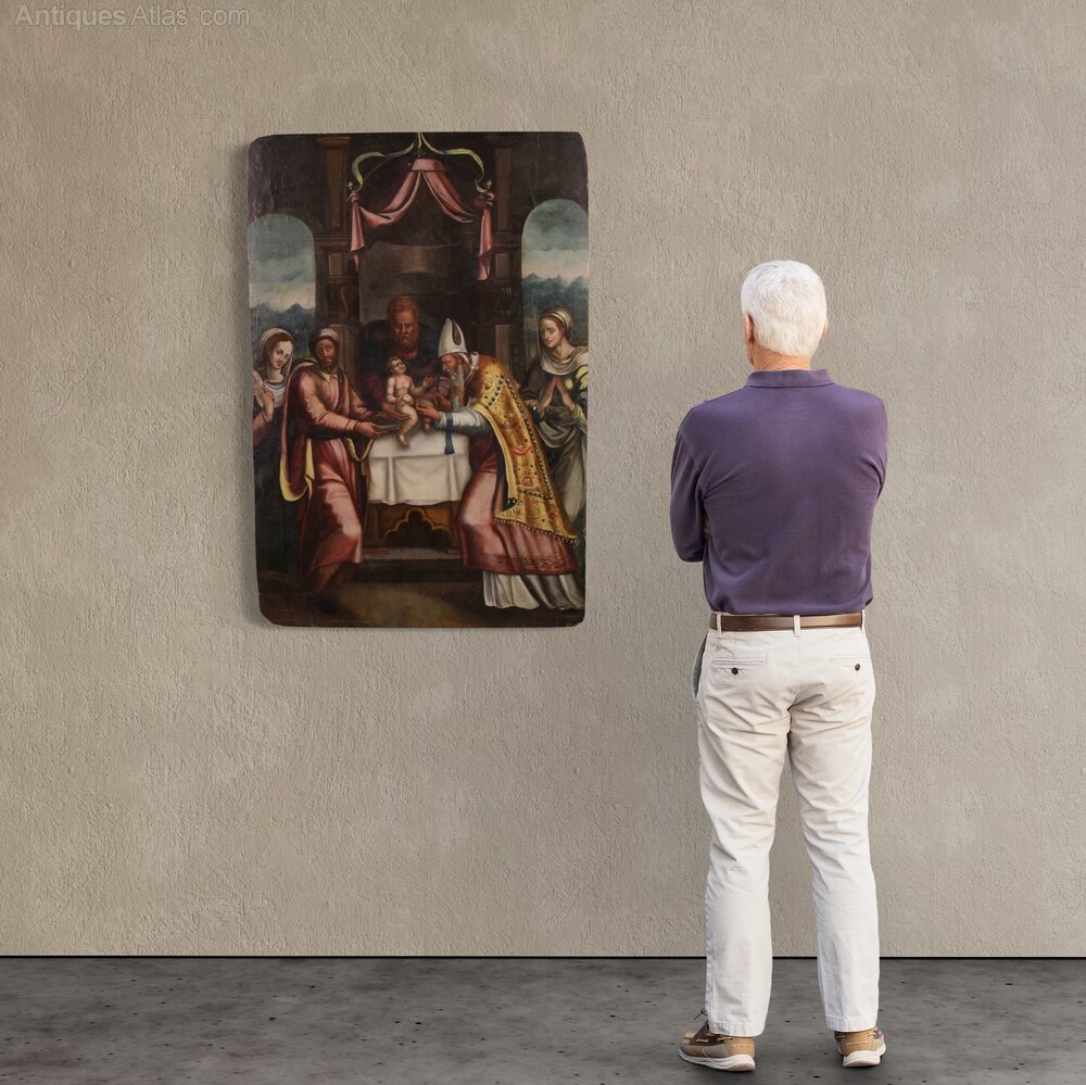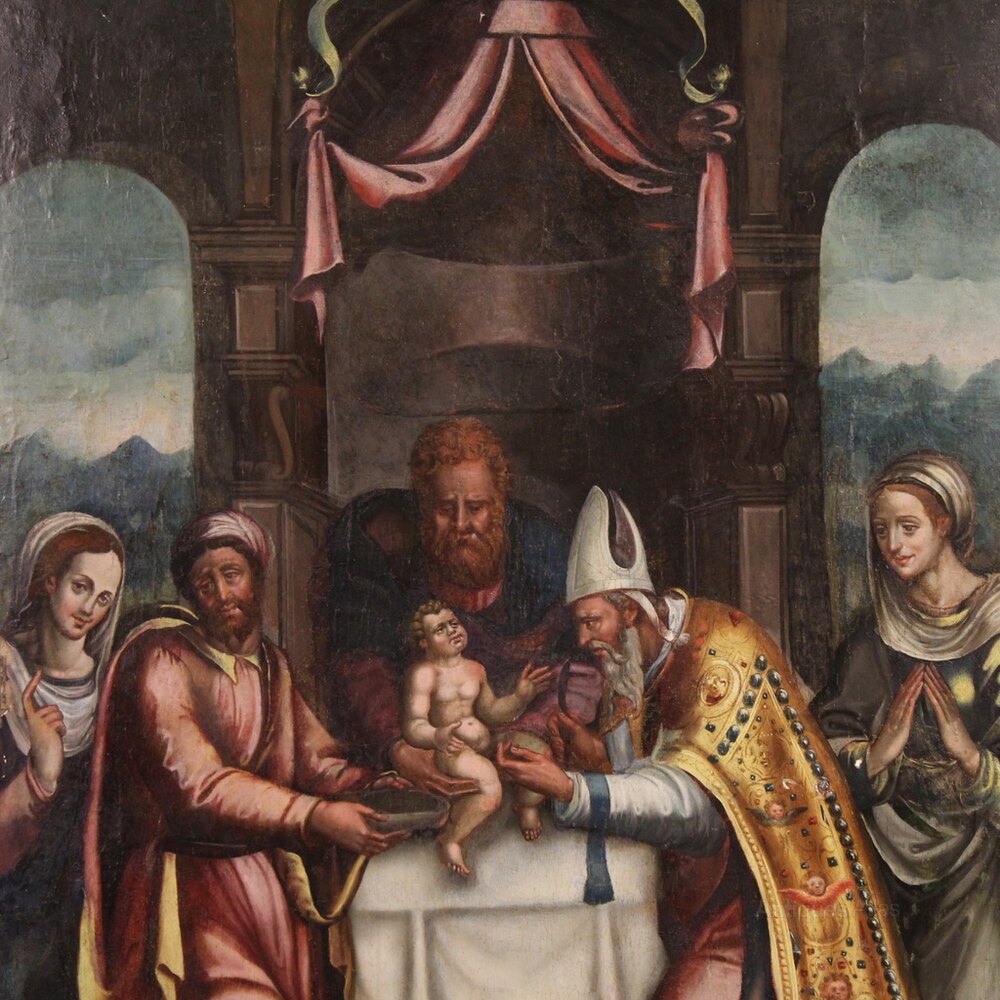 Antique Italian painting from the second half of the 16th century. Oil on panel artwork depicting an important Gospel episode, the circumcision of Jesus, a rare find of remarkable pictorial quality. The scene takes place within a solemn architectural setting, a niche with columns and drapes framing the composition.
