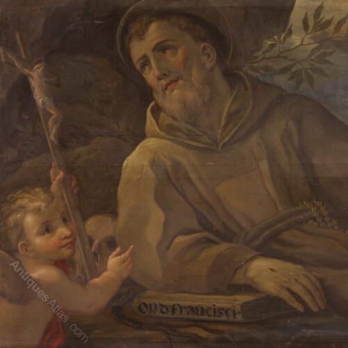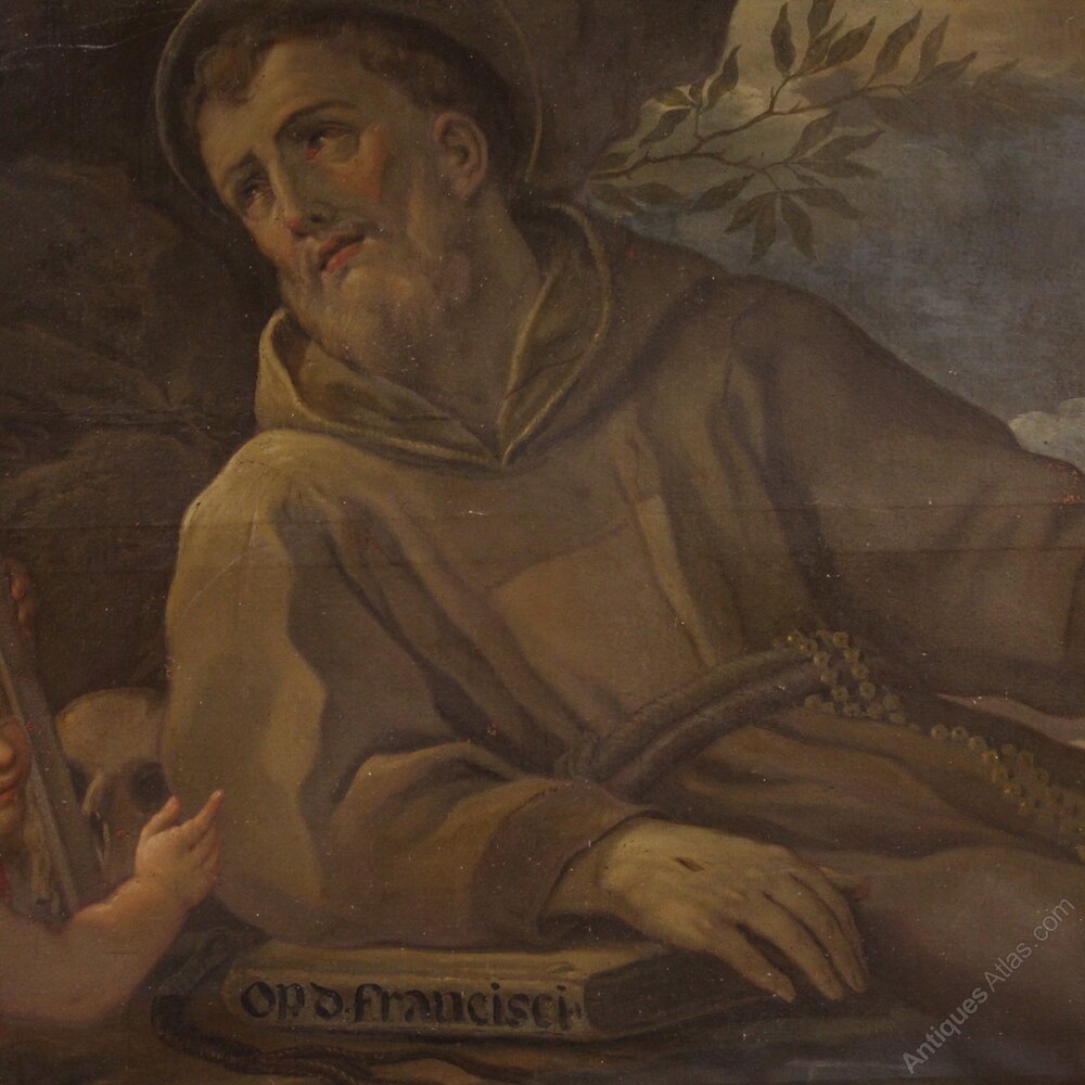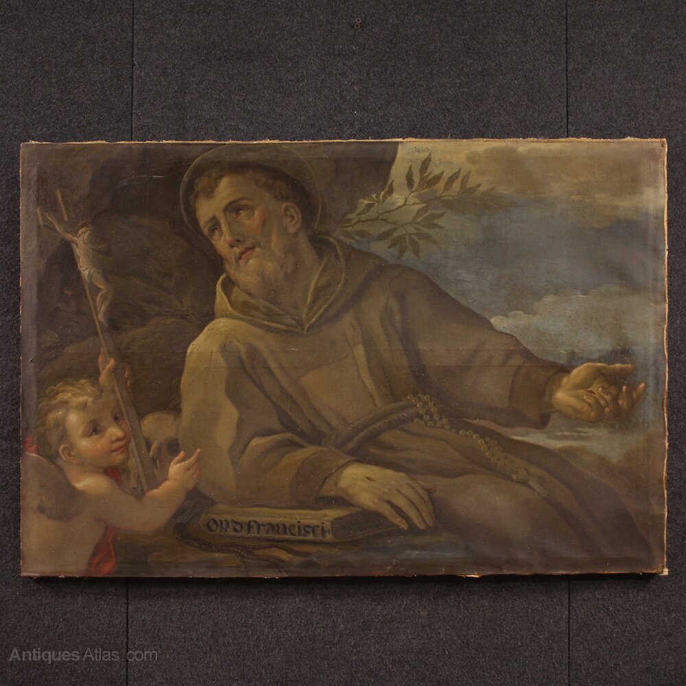 Great Italian painting from the second half of the 18th century. Oil on canvas painting, on the first canvas, depicting Saint Francis of Assisi in ecstasy. The Saint is accompanied by a splendid angel holding a crucifix, flanked by a skull and a scourge, iconographic symbols linked to penance and meditation on the transience of life.