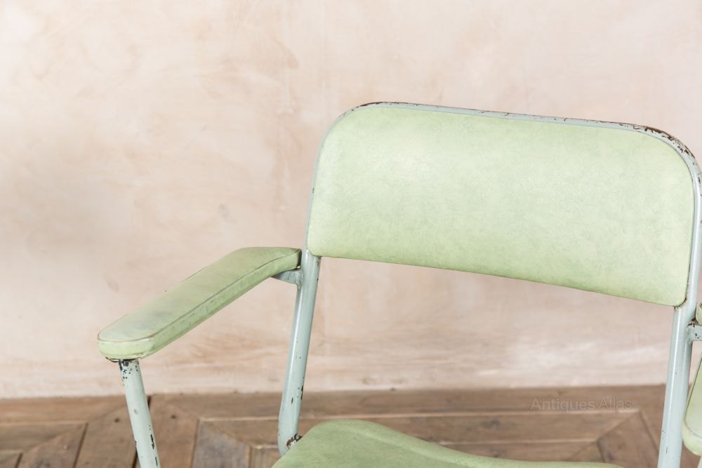These chairs feature a curvy mid-century design and are upholstered in green and yellow vinyl. The chairs are padded for extra comfort.
