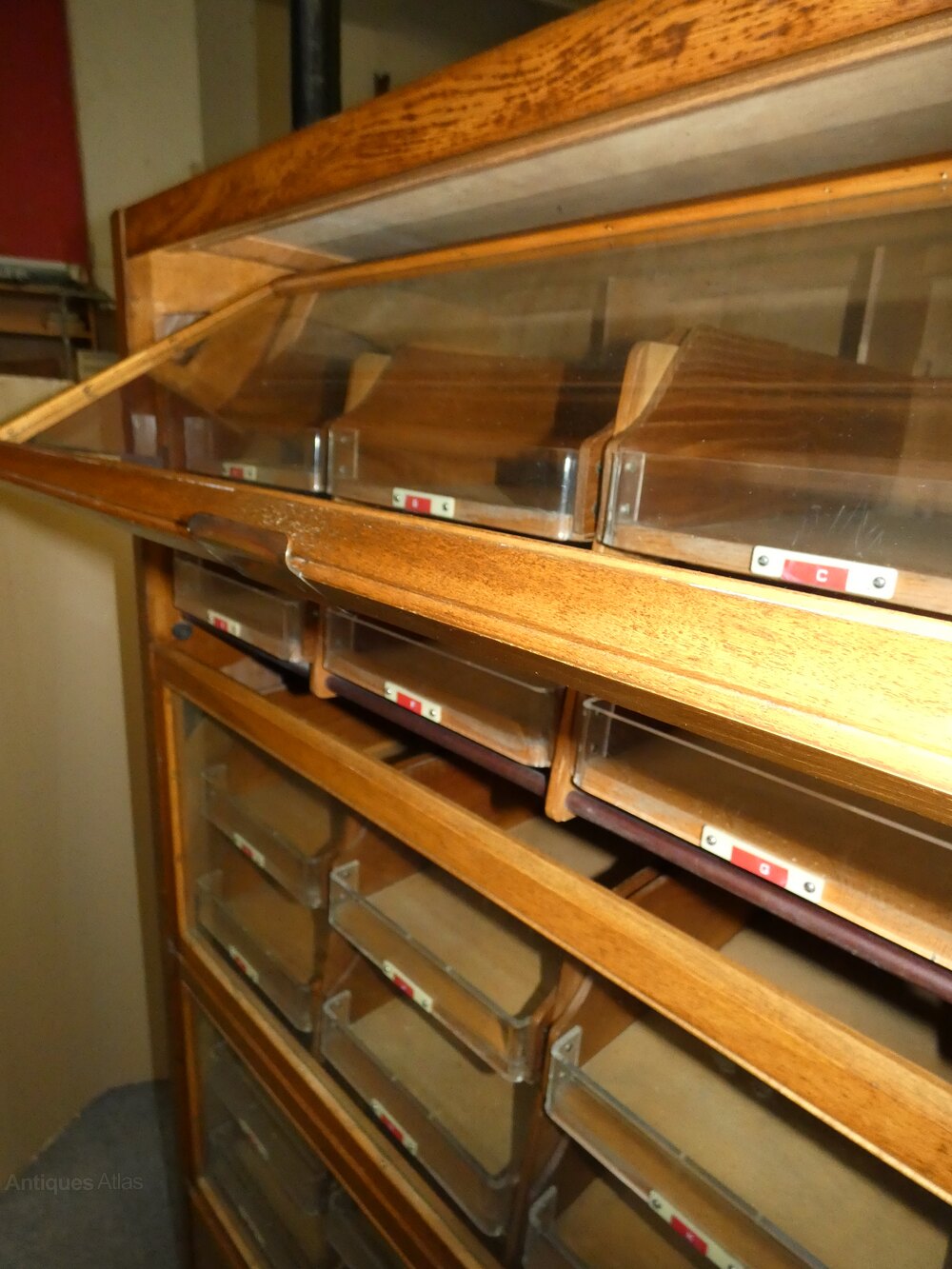 Unusual in its design, the 24 sliding drawers are behind three glass " up and over " action doors, the drawers themselves are are good sized and have heavy perspex fronts and there are a further two large deep drawers to the base, all affording copious storage.