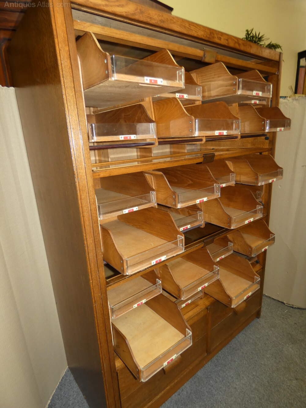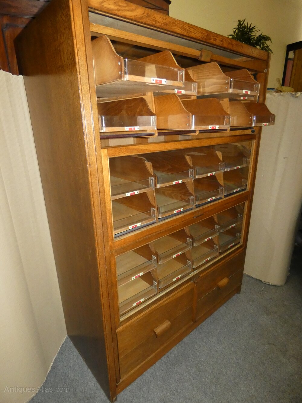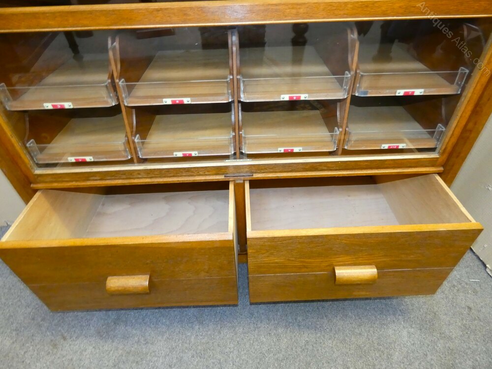Very good quality oak haberdashery cabinet by noted makers Frederick Sage & Co, London.