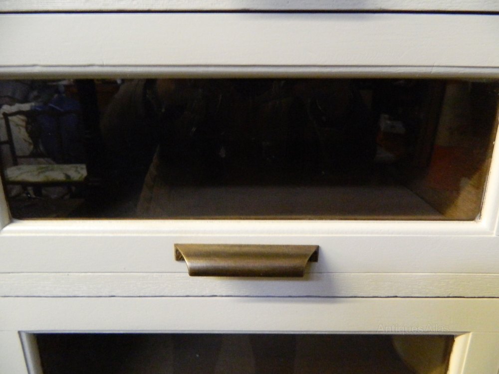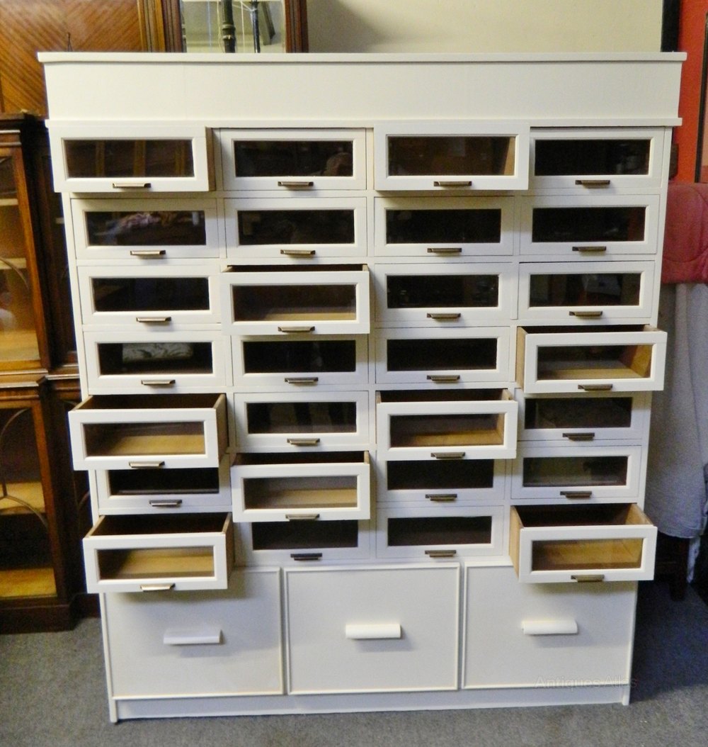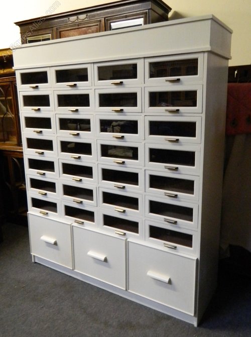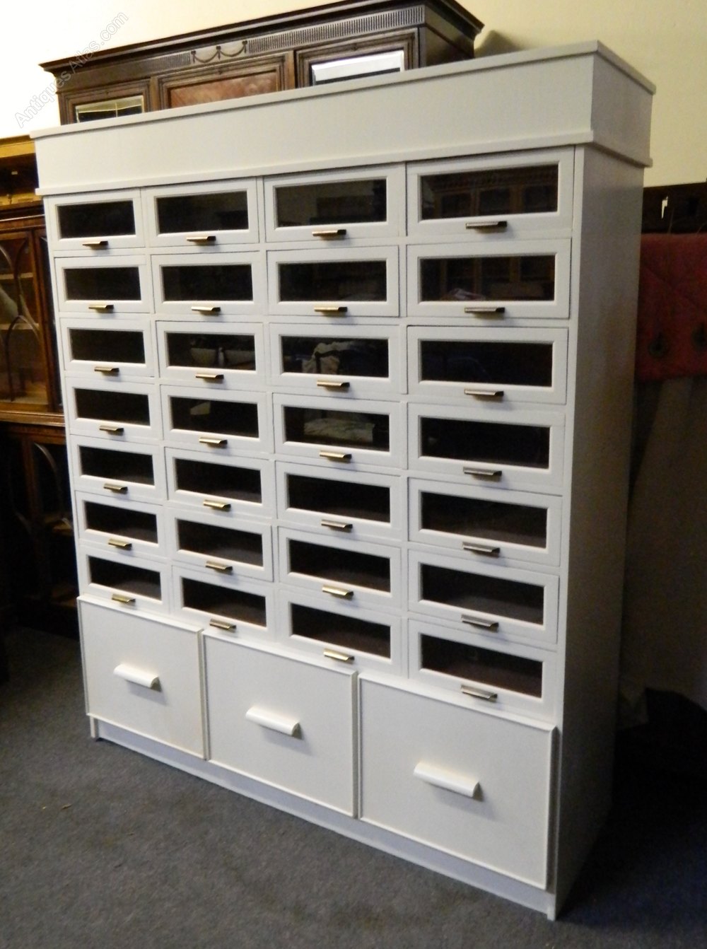 lovely haberdashery cabinet / drapers cabinet painted in an off white finish comprising of 28 glass fronted drawers with metal handles and a further three deep drawers below with wood handles, standing on plinth base.
