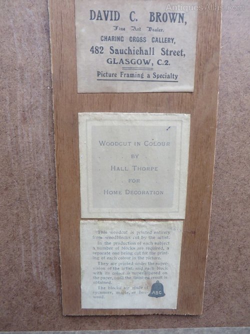 This woodcut has been re mounted and re framed in a simple thin black moulding similar to the original. We have kept the original framers label's and a brief description on the wood cut printing process.