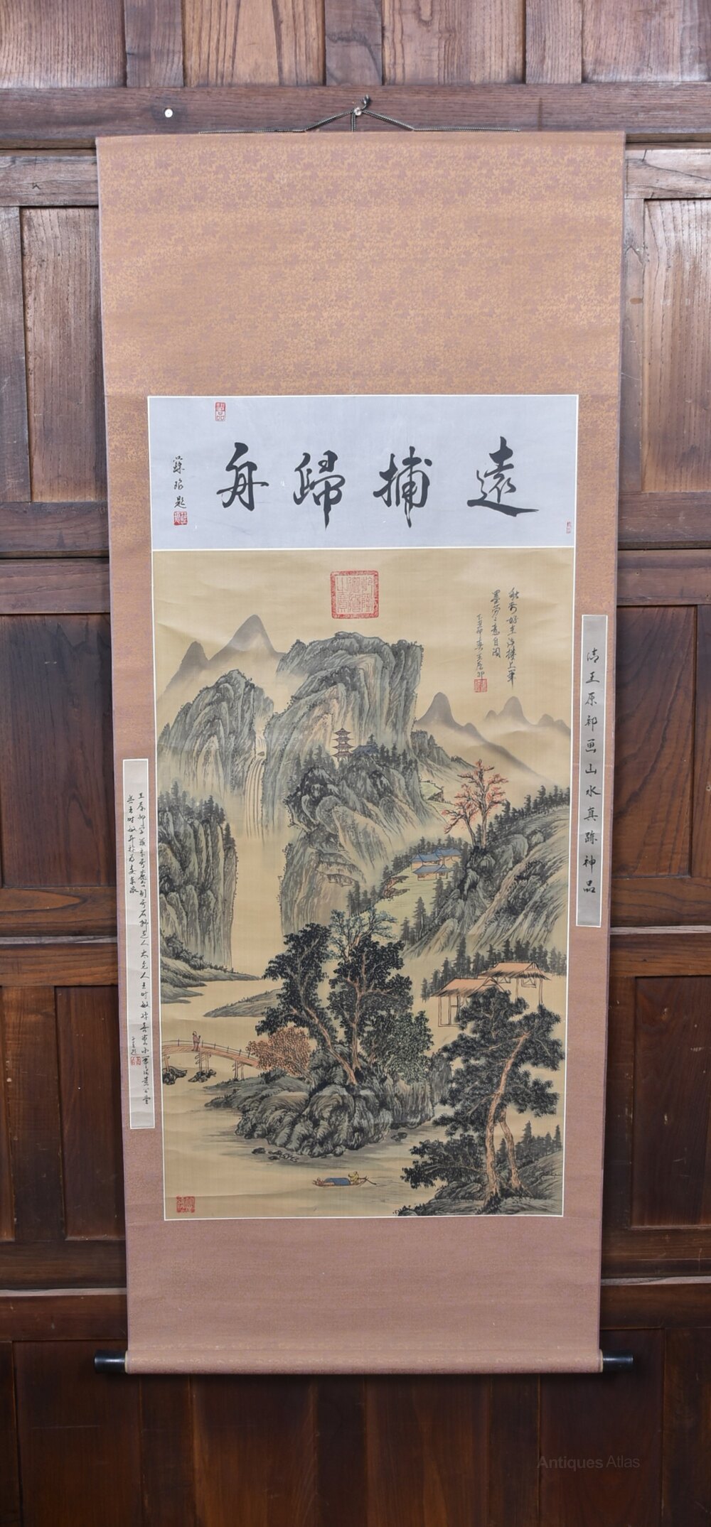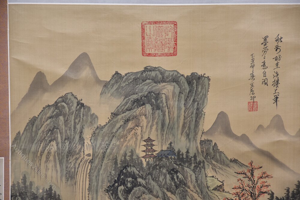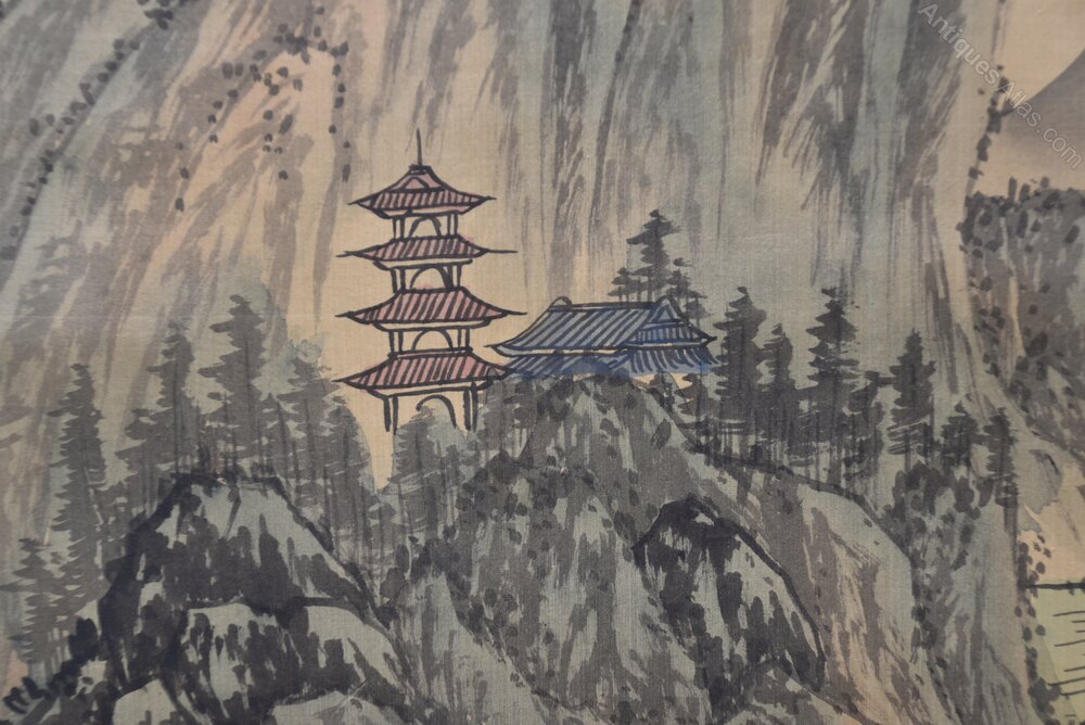 A beautifully hand‑painted Chinese landscape scroll depicting towering mountain peaks rising through drifting mist, with pavilions, trees and a small boat set within the valley below. The artist’s brushwork is delicate and atmospheric, capturing the traditional harmony between nature, water and human presence. The scroll is further enhanced with calligraphic inscriptions, including a poetic title at the top and additional script to the sides, together with several red seals. A striking decorative piece that showcases the elegance of classical Chinese ink painting and would make a serene focal point in any interior.