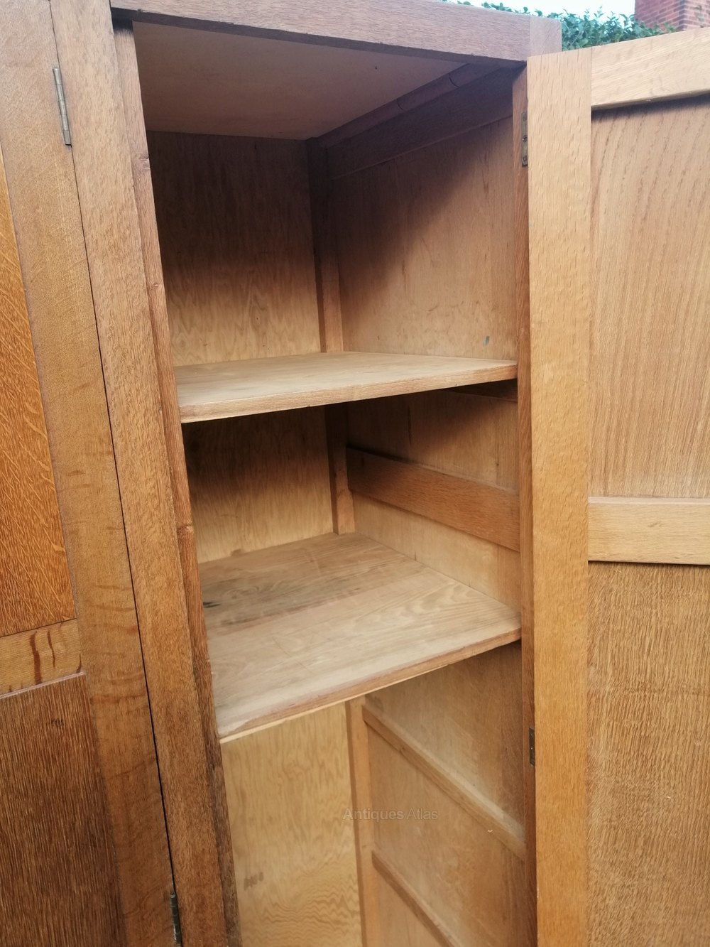 Made to a high standard in the 1930's it has two full length hanging section, with plenty of depth for a large clothes hanger, and the other section has four shelf. (note only two showing on photo)