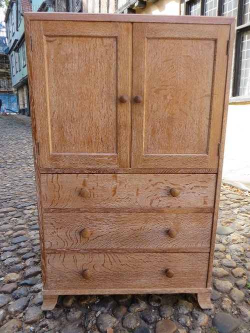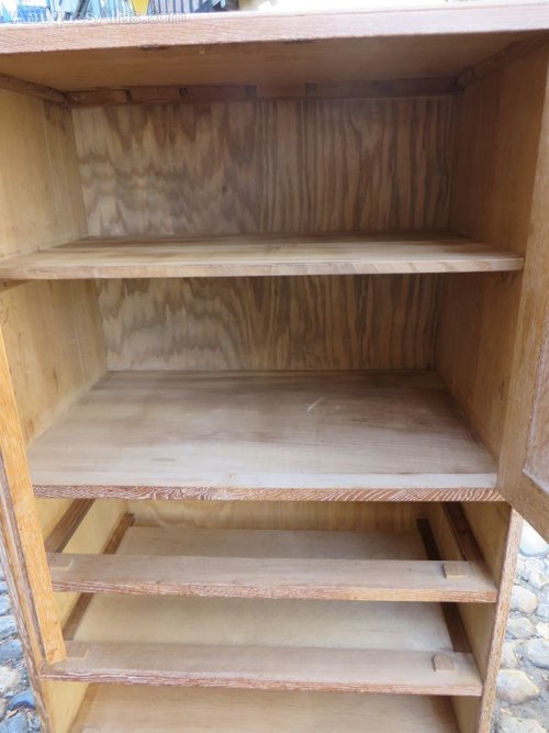 A limed oak Tallboy, twin cupboard doors with a central shelf,
