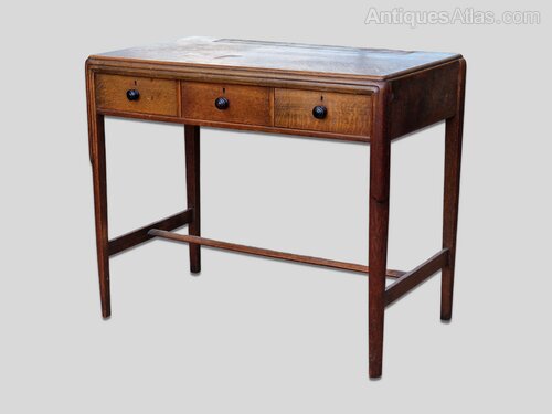 An oak, three drawer side table made by Bath Cabinet Makers for Heal's c.1925. Constructed in solid, well figured, quarter sawn oak. Three frieze drawers with contrasting ebony handles.