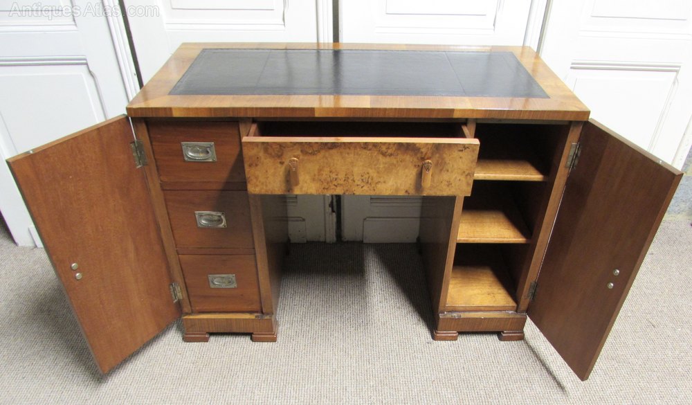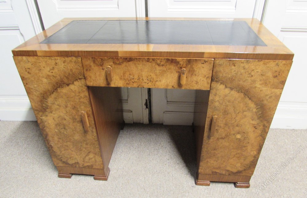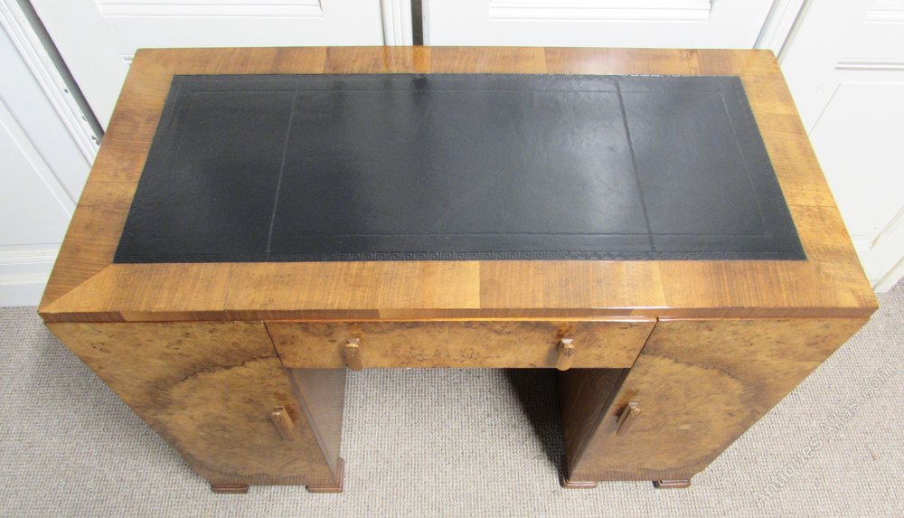 A superb Art Deco Desk. Extremely stylish high Art Deco design. Made from Walnut with Excellent tight Burr Walnut to the outside. The top has a new black leather top. The left hand cupboard opens to reveal 3 mahogany drawers that have the finest dovetails joints. The desk is a lovely and very useful size and very heavy again a sign of quality.