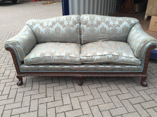 Large comfortable Howard and Sons style sofa.Feather filled cushions though out and standing on ball and claw feet.Ready to go structurally and would require only a top cover.