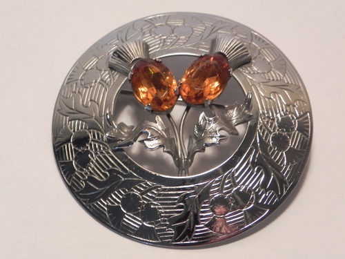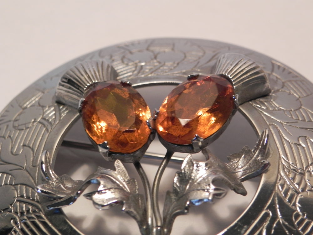 This is a beautiful, substantial, indeed huge, well made silver brooch and with a wonderful theme - the MIZPAH mark is to the back with intertwined love hearts - measuring just under 3" inch diameter (6.9cm), it tests for silver, but I cannot find a hallmark so will sell as "white metal" - to the centre is a wonderful scottish thistle framed within a beautifully engraved shield - all in all a beautiful, stunning piece that will make a special timeless gift for a loved one.