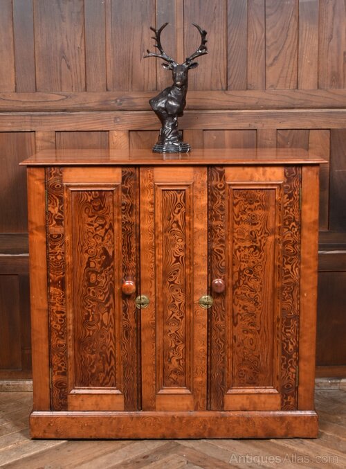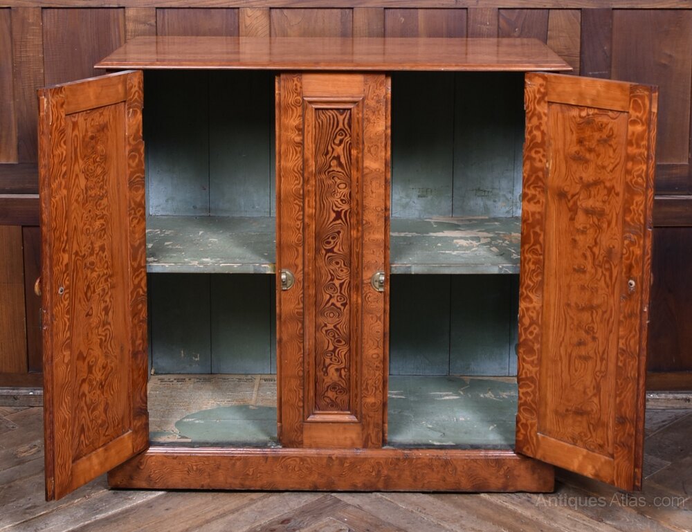 A striking double-door cupboard crafted from richly grained Hungarian ash, presented in excellent antique condition. The top and sides are formed from beautifully figured planks, while the doors and central section each feature three vertical panels framed with subtle mouldings that highlight the natural drama of the timber. Retaining its original turned wooden knobs and a brass swing bar lock, the cupboard opens to reveal a shelved interior—ideal for storing linens, tableware, or household essentials. Its solid plinth base provides both stability and visual weight, and the well-balanced proportions make it equally suited to decorative display or practical use. As with all true antiques, there are minor imperfections consistent with age, but this piece remains a fine example of Central European craftsmanship—combining utility, character, and understated elegance.