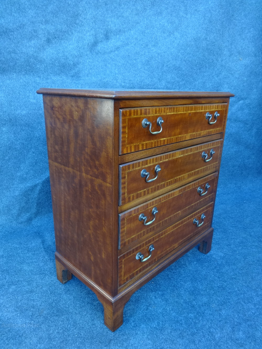 4 drawers with brass handles, inlaid and standing on bracket feet, in very good condition.