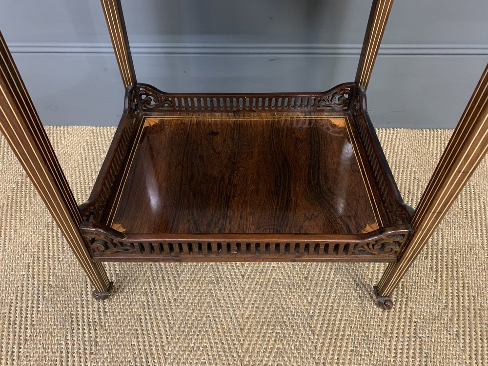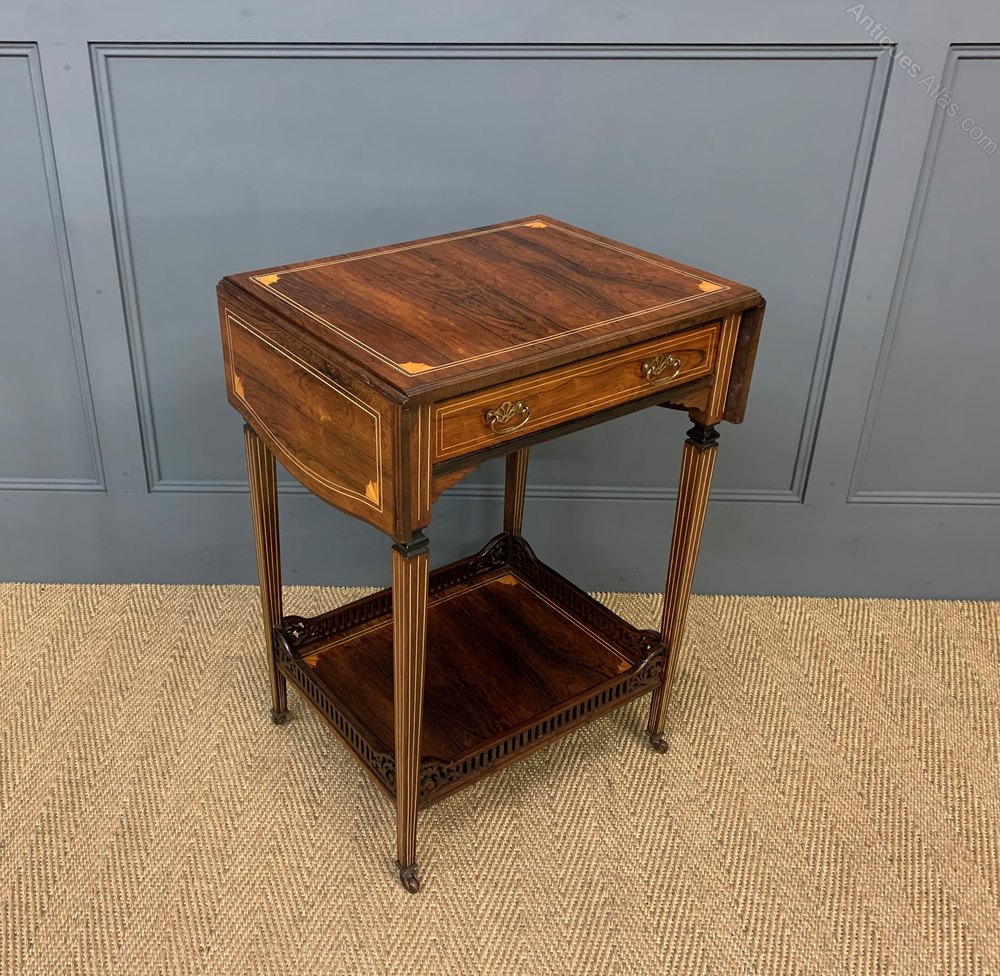 An excellent late Victorian period inlaid rosewood flap table by the renowned cabinet makers Jas Shoolbred and co of London. Well constructed in solid mahogany with attractive rosewood veneers. Decorated with inlaid stringing throughout. With a single drawer to the front, fitted with its original solid brass handles. Standing on elegant square tapering legs, united by an under-tier with open fret work gallery, and terminating in the original castors. Offered for sale in excellent condition with a great colour and patina, ready to go straight into the home.