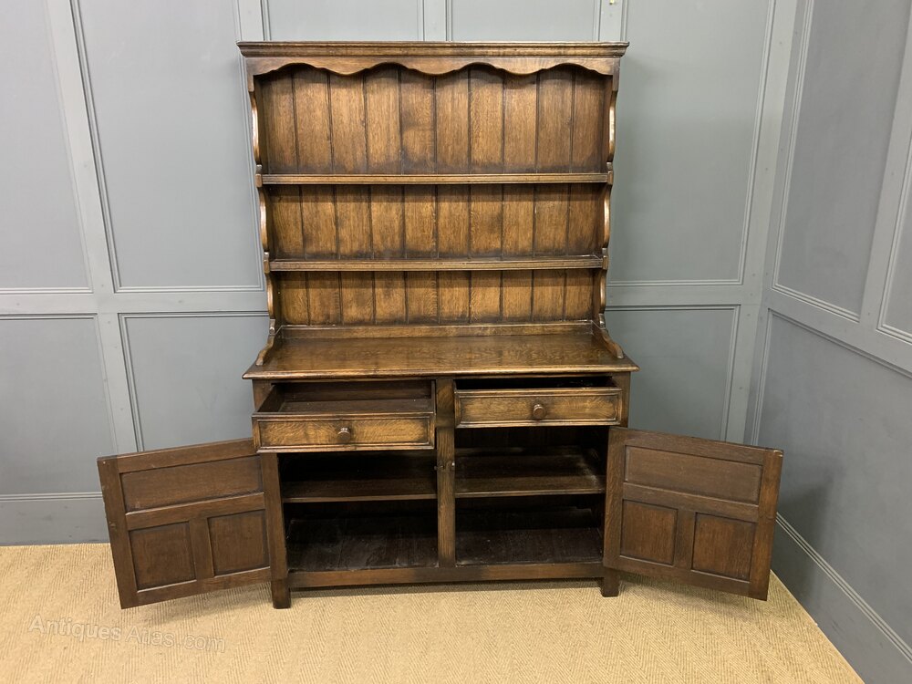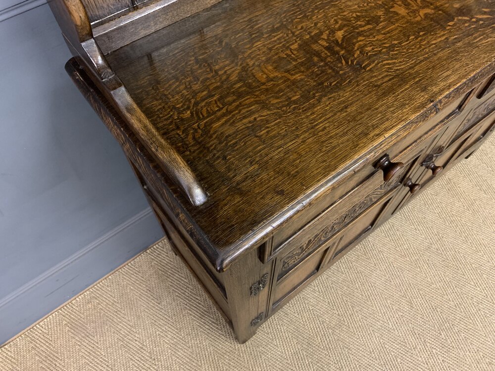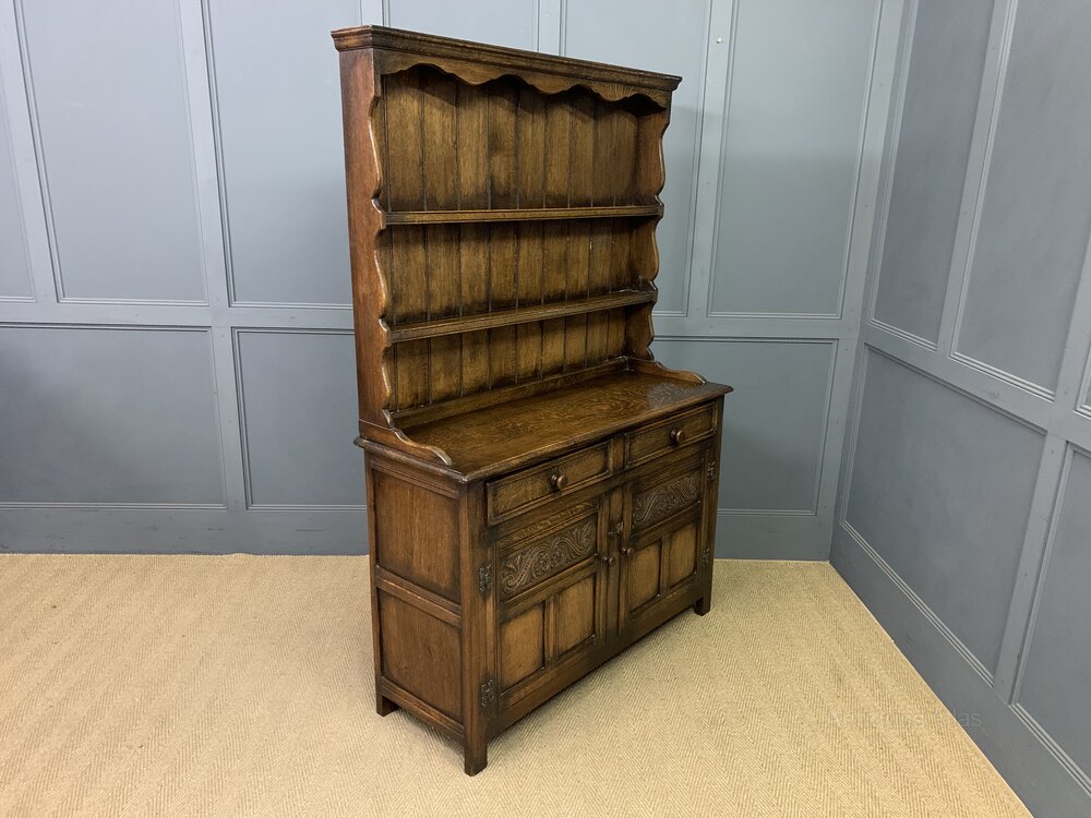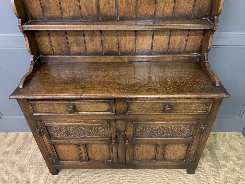 A charming Ipswich oak dresser with a good colour and patina. Well made in solid English oak with a depth of character and charm. The plate rack has shelving for display and the base section has a pair of drawers over a pair of cupboard doors. The doors open to access a shelved interior affording good storage capacity. This dresser is decorated with carved panels to the door fronts. The sides are of fielded paneled construction. This lovely dresser is offered for sale in excellent original condition, cleaned and waxed in our workshops , ready straight into go into the home.