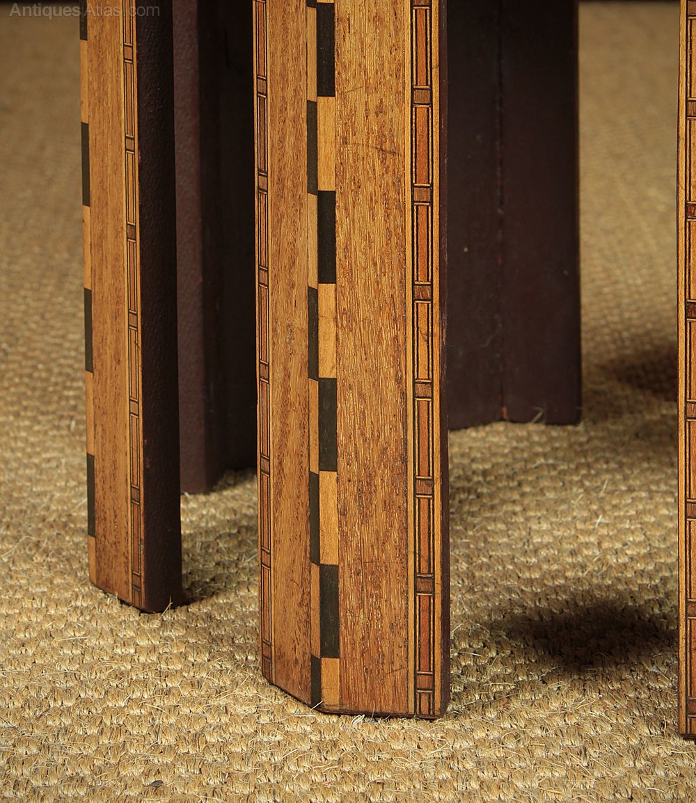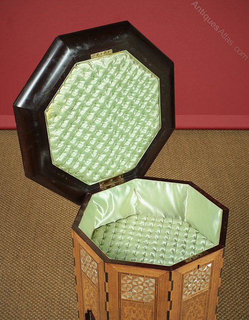 Unusual hinged lid work box version of the classic Arabic or Moorish inlaid side table c.1910. 18½” diameter octagonal top with raised edge. Beautifully inlaid with mother of pearl and contrasting timbers to make a geometric pattern around a central lozenge featuring a supplication to God using His name ‘The Most Generous’ in Islamic script. Opening with a key to reveal a silk lined interior with padded base. Shaped apron to the sides featuring a repeated arch borrowed from Islamic architecture, also inlaid to match. Excellent colour and condition, cleaned and waxed in our workshops. Key supplied.