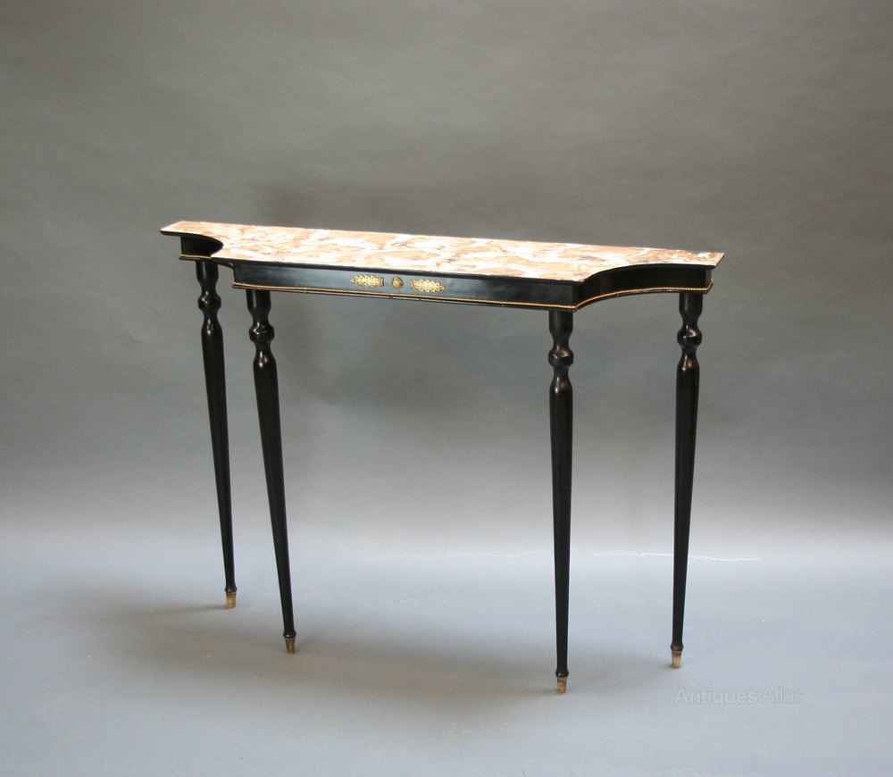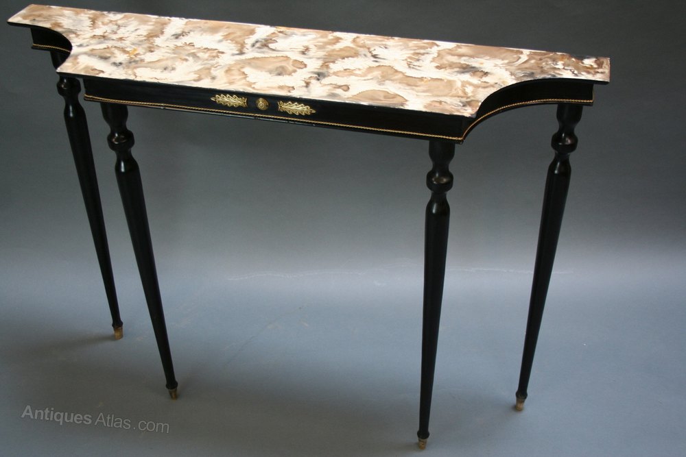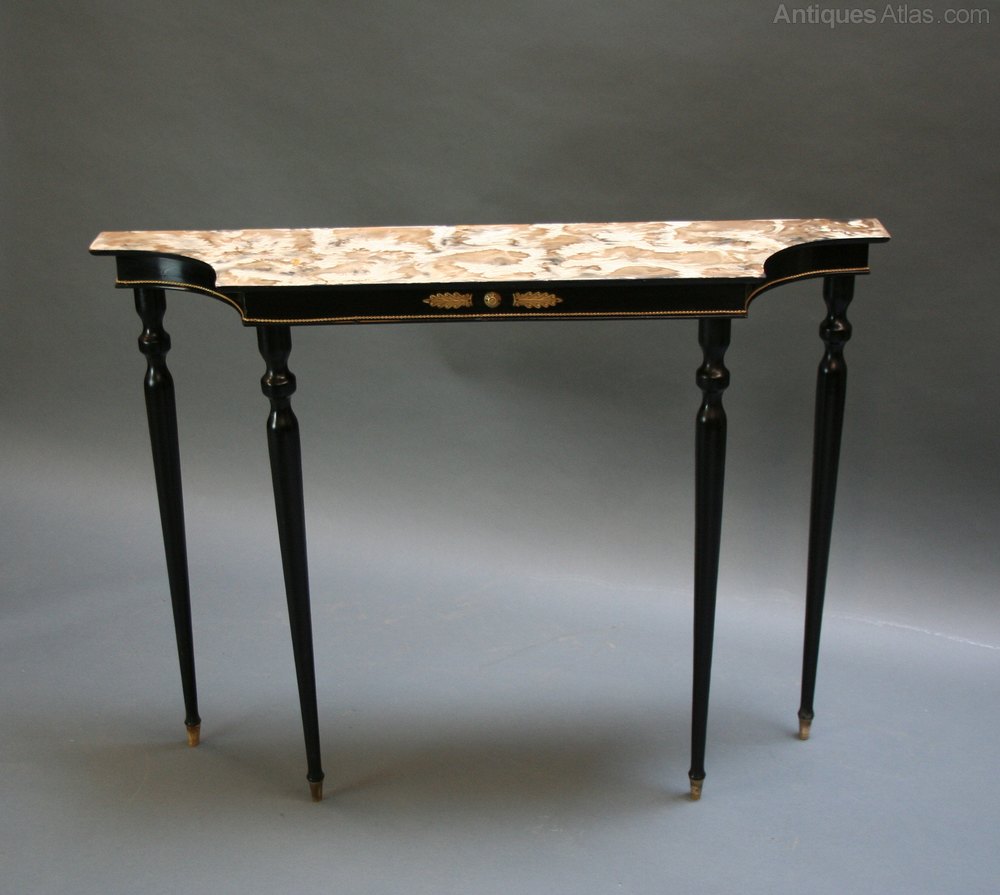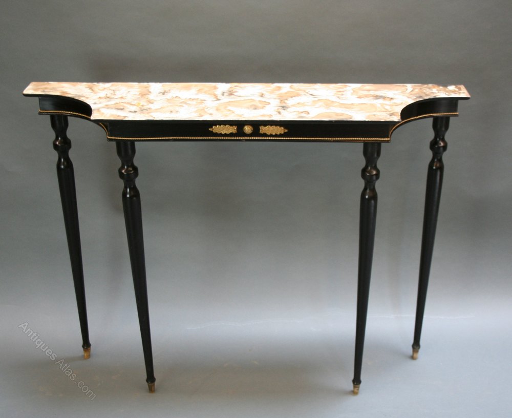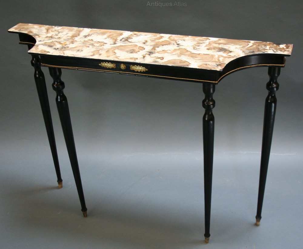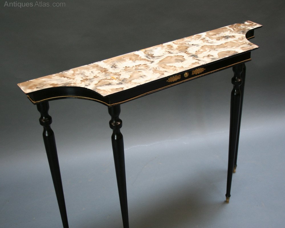 Mid Twentieth Century Italian elegance in the manner of Paolo Buffa having a faux marble top over an ebonised frame gilt mounted frieze and slender turned supports
